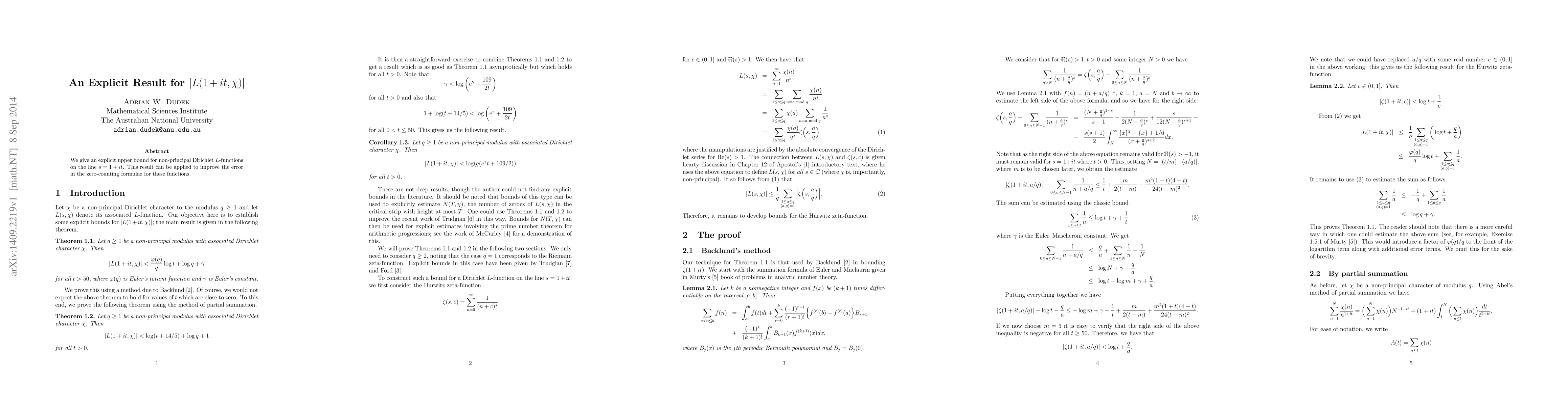 This research provides an explicit upper bound for the non-principal Dirichlet $L$-functions along the line $s=1+it$, which enhances the accuracy of zero-counting formulas for these functions.