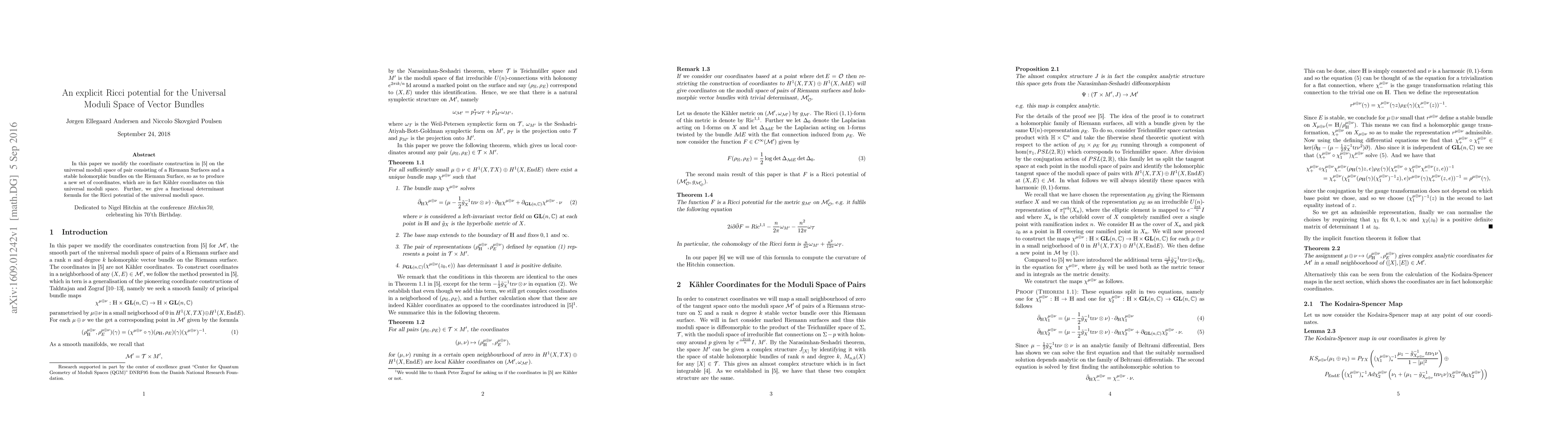 In this paper we modify the coordinate construction in our previous paper on the universal moduli space of pair consisting of a Riemann Surfaces and a stable holomorphic bundles on the Riemann Surface, so as to produce a new set of coordinates, which are in fact K\" ahler coordinates on this universal moduli space. Further, we give a functional determinant formula for the Ricci potential of the universal moduli space.