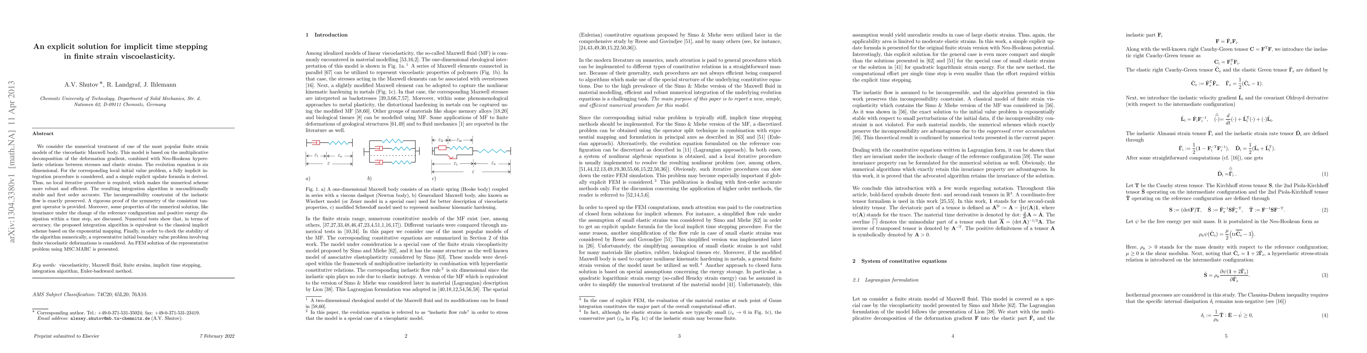 This research presents an explicit update formula for implicit time stepping in finite strain viscoelasticity, specifically for the Maxwell body model. The method ensures robustness, efficiency, stability, and first-order accuracy without the need for local iterative procedures. Numerical tests show its equivalence to classical implicit schemes, with stability confirmed through a representative initial boundary value problem.