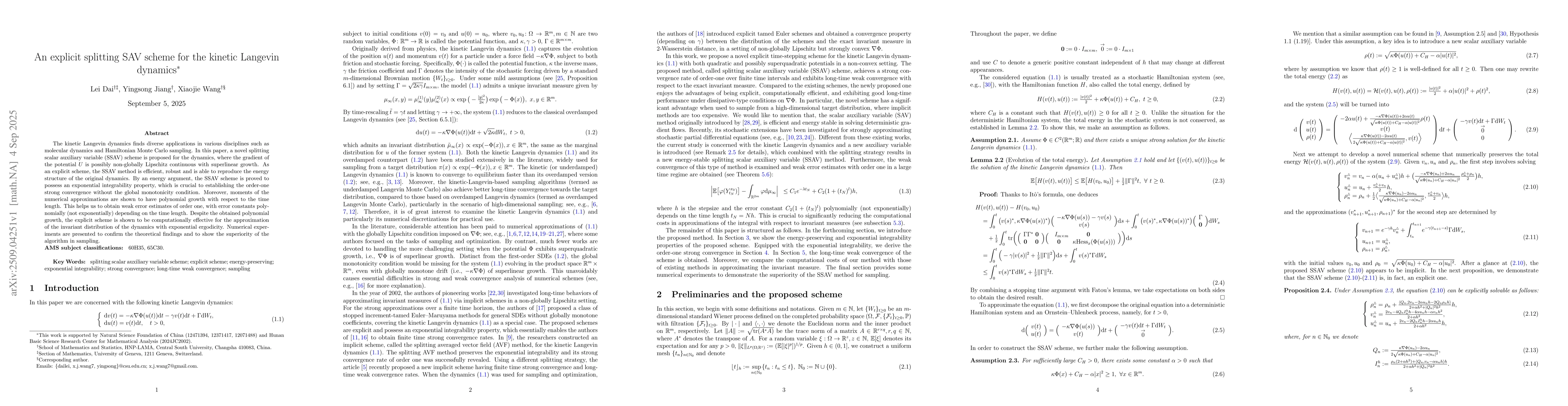 The kinetic Langevin dynamics finds diverse applications in various disciplines such as molecular dynamics and Hamiltonian Monte Carlo sampling. In this paper, a novel splitting scalar auxiliary variable (SSAV) scheme is proposed for the dynamics, where the gradient of the potential $U$ is possibly non-globally Lipschitz continuous with superlinear growth. As an explicit scheme, the SSAV method is efficient, robust and is able to reproduce the energy structure of the original dynamics. By an energy argument, the SSAV scheme is proved to possess an exponential integrability property, which is crucial to establishing the order-one strong convergence without the global monotonicity condition. Moreover, moments of the numerical approximations are shown to have polynomial growth with respect to the time length. This helps us to obtain weak error estimates of order one, with error constants polynomially (not exponentially) depending on the time length. Despite the obtained polynomial growth, the explicit scheme is shown to be computationally effective for the approximation of the invariant distribution of the dynamics with exponential ergodicity. Numerical experiments are presented to confirm the theoretical findings and to show the superiority of the algorithm in sampling.