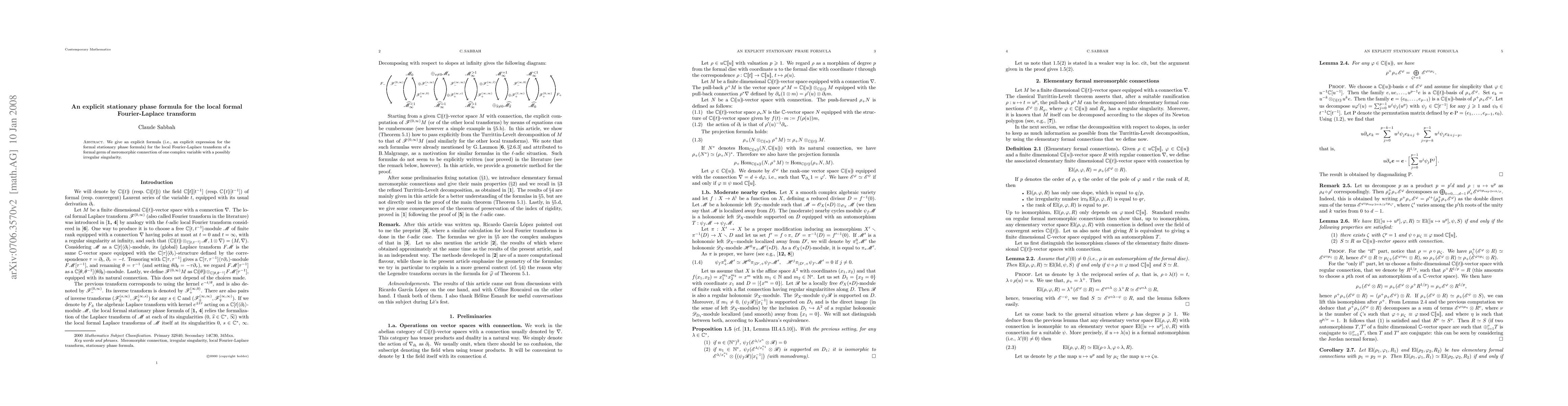 The paper introduces an explicit stationary phase formula for the local formal Fourier-Laplace transform, offering a detailed analysis of meromorphic connections with irregular singularities.