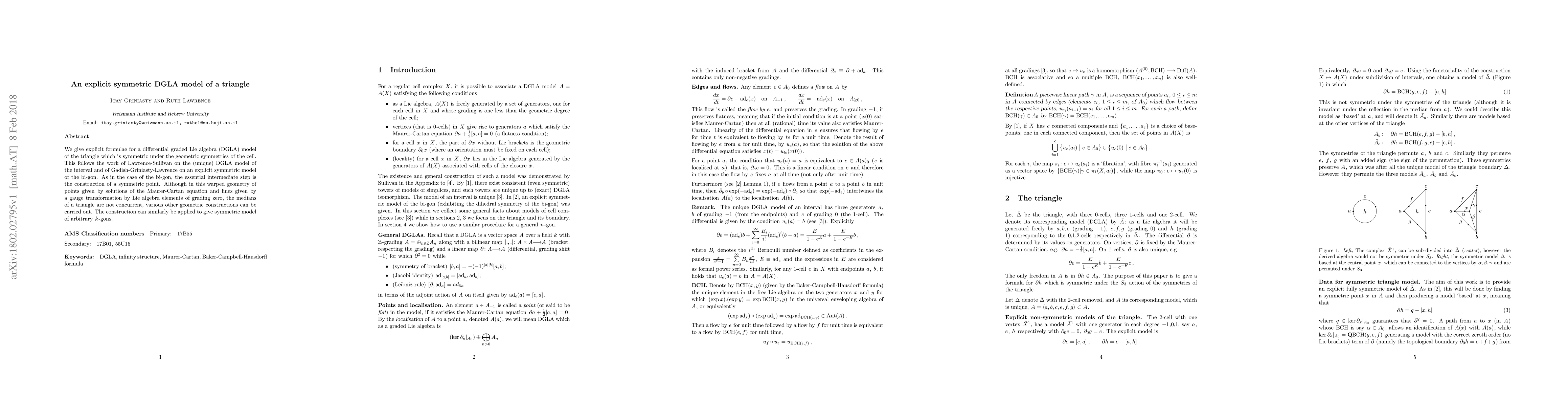 We give explicit formulae for a differential graded Lie algebra (DGLA) model of the triangle which is symmetric under the geometric symmetries of the cell. This follows the work of Lawrence-Sullivan on the (unique) DGLA model of the interval and of Gadish-Griniasty-Lawrence on an explicit symmetric model of the bi-gon. As in the case of the bi-gon, the essential intermediate step is the construction of a symmetric point. Although in this warped geometry of points given by solutions of the Maurer-Cartan equation and lines given by a gauge transformation by Lie algebra elements of grading zero, the medians of a triangle are not concurrent, various other geometric constructions can be carried out. The construction can similarly be applied to give symmetric model of arbitrary $k$-gons.