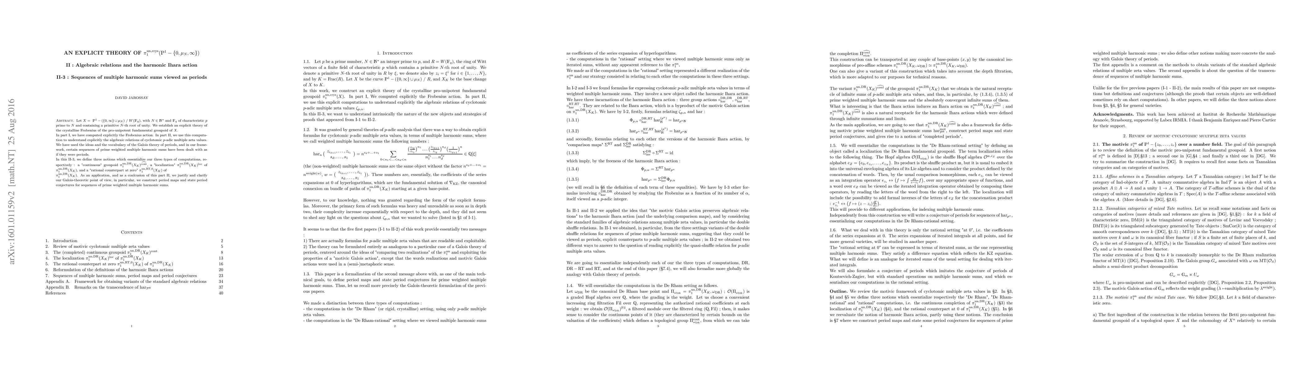 Let $X=\text{ }\mathbb{P}^{1} - (\{0,\infty\} \cup \mu_{N})\text{ }/\text{ }W(\mathbb{F}_{q})$, with $N \in \mathbb{N}^{\ast}$ and $\mathbb{F}_{q}$ of characteristic $p$ prime to $N$ and containing a primitive $N$-th root of unity. We establish an explicit theory of the crystalline Frobenius of the pro-unipotent fundamental groupoid of $X$. In part I, we have computed explicitly the Frobenius action. In part II, we use this computation to understand explicitly the algebraic relations of cyclotomic $p$-adic multiple zeta values. We have used the ideas and the vocabulary of the Galois theory of periods, and in our framework, certain sequences of prime weighted multiple harmonic sums have been dealt with as if they were periods. In this II-3, we define three notions which essentialize our three types of computations, respectively : a "continuous" groupoid $\pi_{1}^{\un,\DR}(X_{K})^{\hat{\text{cont}}}$, a "localization" $\pi_{1}^{\un,\DR}(X_{K})^{\loc}$ of $\pi_{1}^{\un,\DR}(X_{K})$, and a "rational counterpart at zero" $\pi_{1}^{\un,\RT,0}(X_{K})$ of $\pi_{1}^{\un,\DR}(X_{K})$. As an application, and as a conlcusion of this part II, we justify and clarify our Galois-theoretic point of view, in particular, we construct period maps and state period conjectures for sequences of prime weighted multiple harmonic sums.