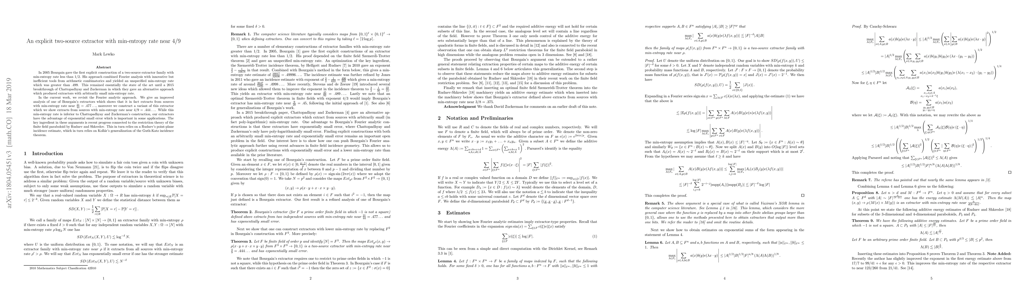This research paper improves upon an existing two-source extractor approach using Fourier analysis, achieving a min-entropy rate near 4/9 while maintaining exponential small error.
