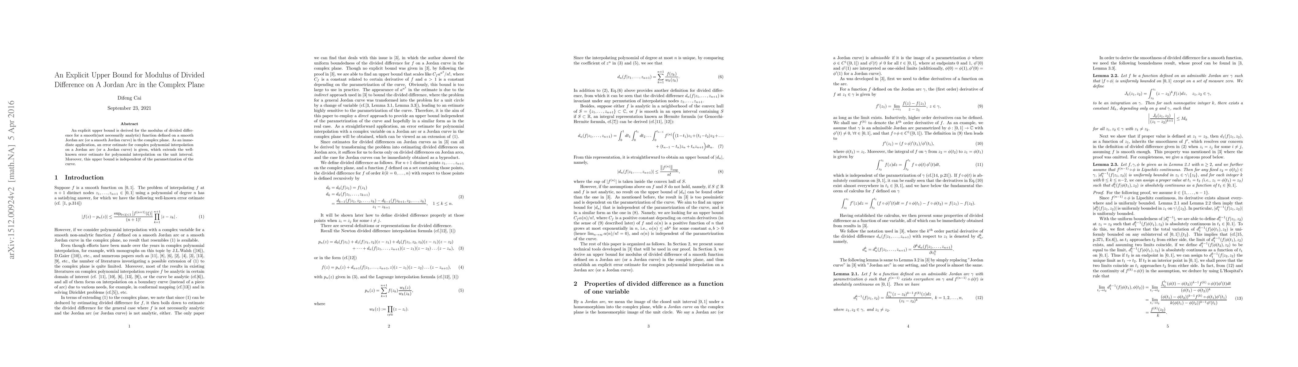 An explicit upper bound is derived for the modulus of divided difference for a smooth(not necessarily analytic) function defined on a smooth Jordan arc (or a smooth Jordan curve) in the complex plane. As an immediate application, an error estimate for complex polynomial interpolation on a Jordan arc (or a Jordan curve) is given, which extends the well-known error estimate for polynomial interpolation on the unit interval. Moreover, this upper bound is independent of the parametrization of the curve.