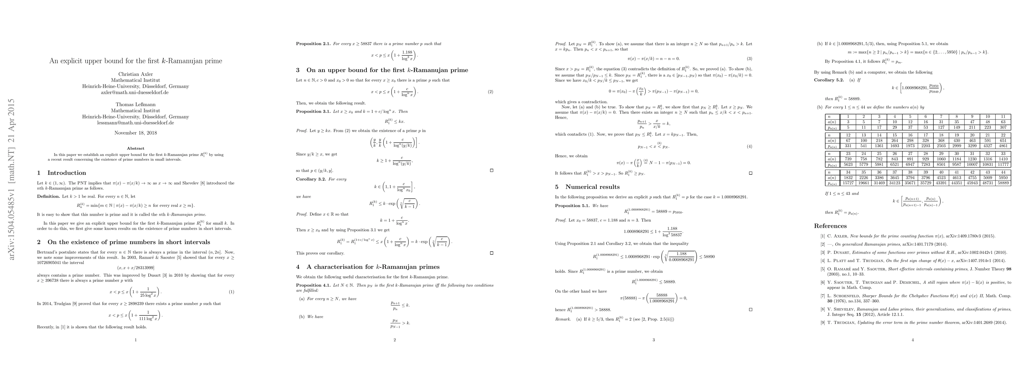 This paper provides an explicit upper bound for the first $k$-Ramanujan prime $R_1^{(k)}$, leveraging a recent finding on the distribution of prime numbers within small intervals. The result enhances our understanding of the distribution of these special primes.