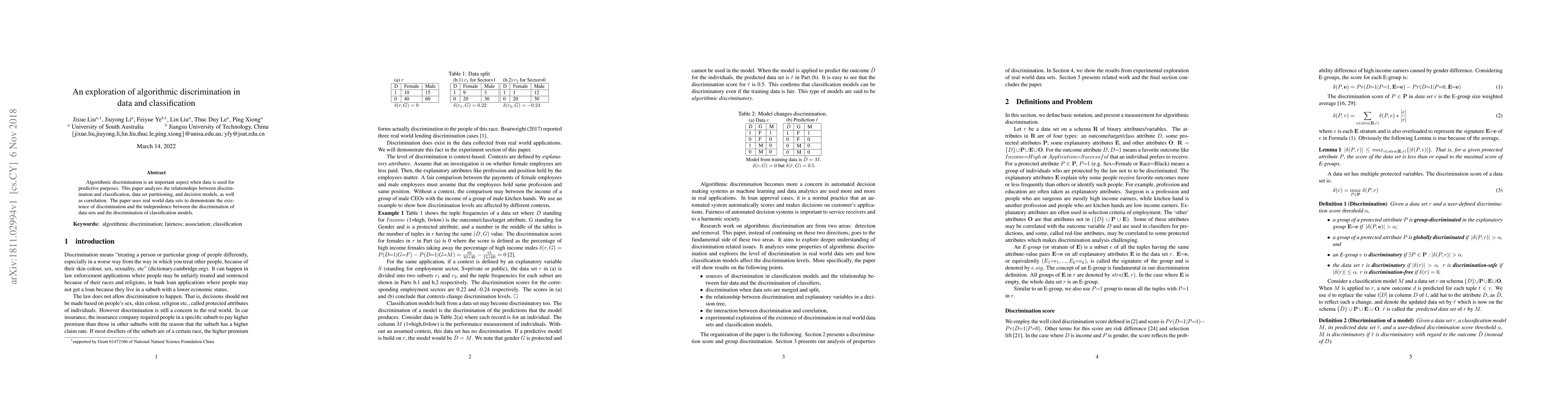 Algorithmic discrimination is an important aspect when data is used for predictive purposes. This paper analyzes the relationships between discrimination and classification, data set partitioning, and decision models, as well as correlation. The paper uses real world data sets to demonstrate the existence of discrimination and the independence between the discrimination of data sets and the discrimination of classification models.
