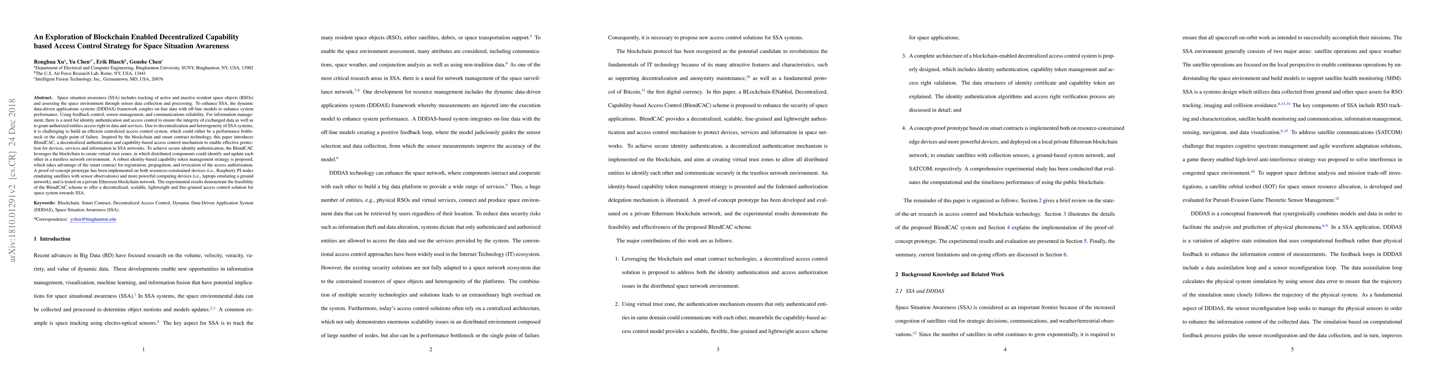 This paper introduces BlendCAC, a decentralized capability-based access control strategy leveraging blockchain for space situation awareness (SSA). It aims to provide secure identity authentication and fine-grained access control in the decentralized and heterogeneous SSA environment, demonstrating feasibility through a proof-of-concept prototype on an Ethereum blockchain.