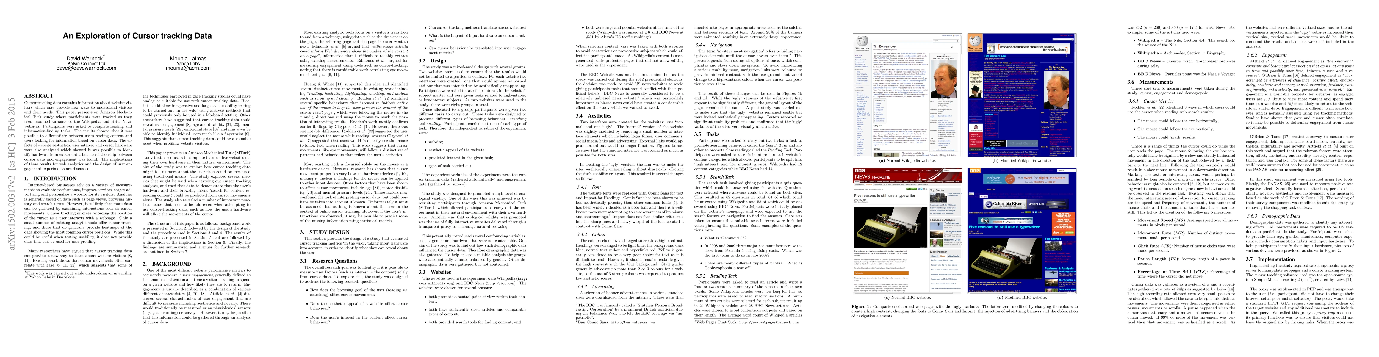 Cursor tracking data contains information about website visitors which may provide new ways to understand visitors and their needs. This paper presents an Amazon Mechanical Turk study where participants were tracked as they used modified variants of the Wikipedia and BBC News websites. Participants were asked to complete reading and information-finding tasks. The results showed that it was possible to differentiate between users reading content and users looking for information based on cursor data. The effects of website aesthetics, user interest and cursor hardware were also analysed which showed it was possible to identify hardware from cursor data, but no relationship between cursor data and engagement was found. The implications of these results, from the impact on web analytics to the design of experiments to assess user engagement, are discussed.