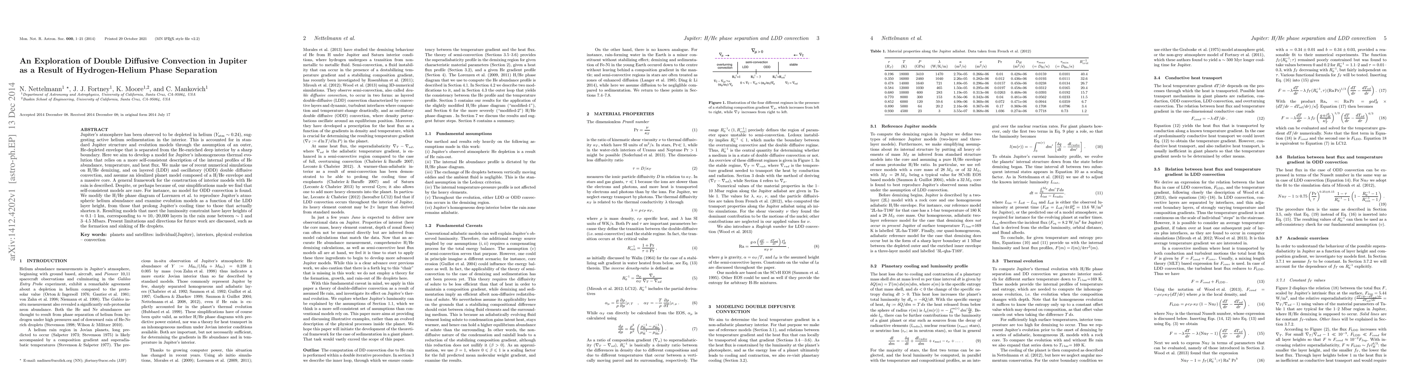 Jupiter's atmosphere has been observed to be depleted in helium (Yatm~0.24), suggesting active helium sedimentation in the interior. This is accounted for in standard Jupiter structure and evolution models through the assumption of an outer, He-depleted envelope that is separated from the He-enriched deep interior by a sharp boundary. Here we aim to develop a model for Jupiter's inhomogeneous thermal evolution that relies on a more self-consistent description of the internal profiles of He abundance, temperature, and heat flux. We make use of recent numerical simulations on H/He demixing, and on layered (LDD) and oscillatory (ODD) double diffusive convection, and assume an idealized planet model composed of a H/He envelope and a massive core. A general framework for the construction of interior models with He rain is described. Despite, or perhaps because of, our simplifications made we find that self-consistent models are rare. For instance, no model for ODD convection is found. We modify the H/He phase diagram of Lorenzen et al. to reproduce Jupiter's atmospheric helium abundance and examine evolution models as a function of the LDD layer height, from those that prolong Jupiter's cooling time to those that actually shorten it. Resulting models that meet the luminosity constraint have layer heights of about 0.1-1 km, corresponding to ~10,-20,000 layers in the rain zone between ~1 and 3-4.5 Mbars. Present limitations and directions for future work are discussed, such as the formation and sinking of He droplets.
