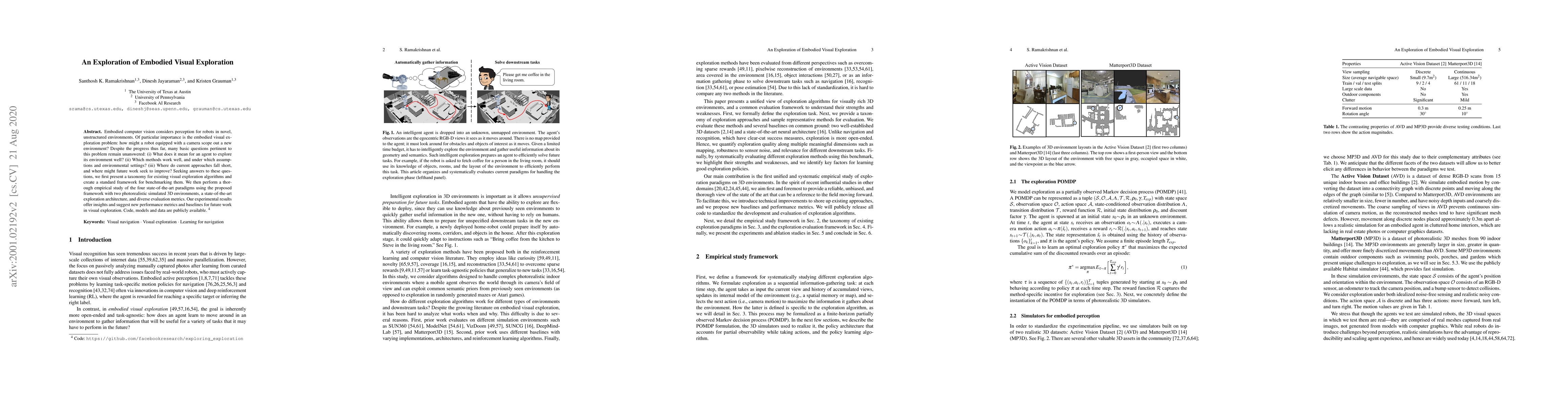 Embodied computer vision considers perception for robots in novel, unstructured environments. Of particular importance is the embodied visual exploration problem: how might a robot equipped with a camera scope out a new environment? Despite the progress thus far, many basic questions pertinent to this problem remain unanswered: (i) What does it mean for an agent to explore its environment well? (ii) Which methods work well, and under which assumptions and environmental settings? (iii) Where do current approaches fall short, and where might future work seek to improve? Seeking answers to these questions, we first present a taxonomy for existing visual exploration algorithms and create a standard framework for benchmarking them. We then perform a thorough empirical study of the four state-of-the-art paradigms using the proposed framework with two photorealistic simulated 3D environments, a state-of-the-art exploration architecture, and diverse evaluation metrics. Our experimental results offer insights and suggest new performance metrics and baselines for future work in visual exploration. Code, models and data are publicly available: https://github.com/facebookresearch/exploring_exploration