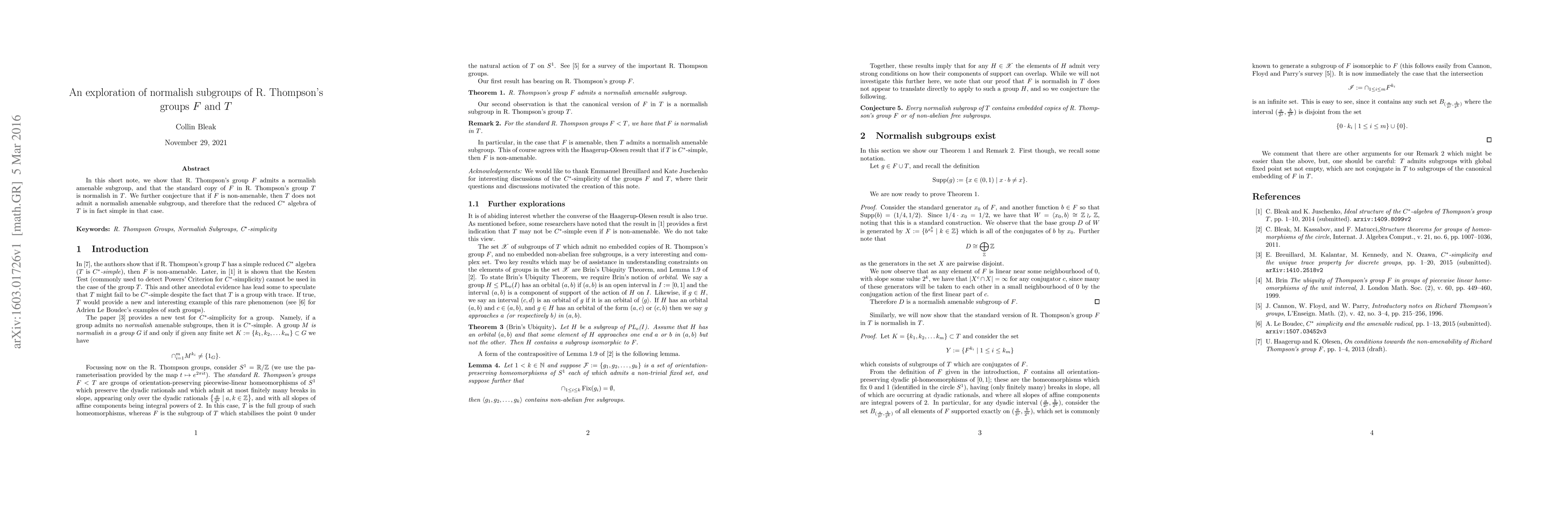 In this short note, we show that R. Thompson's group $F$ admits a normalish amenable subgroup, and that the standard copy of $F$ in R. Thompson's group $T$ is normalish in $T$. We further conjecture that if $F$ is non-amenable, then $T$ does not admit a normalish amenable subgroup, and therefore that the reduced $C^*$ algebra of $T$ is in fact simple in that case.