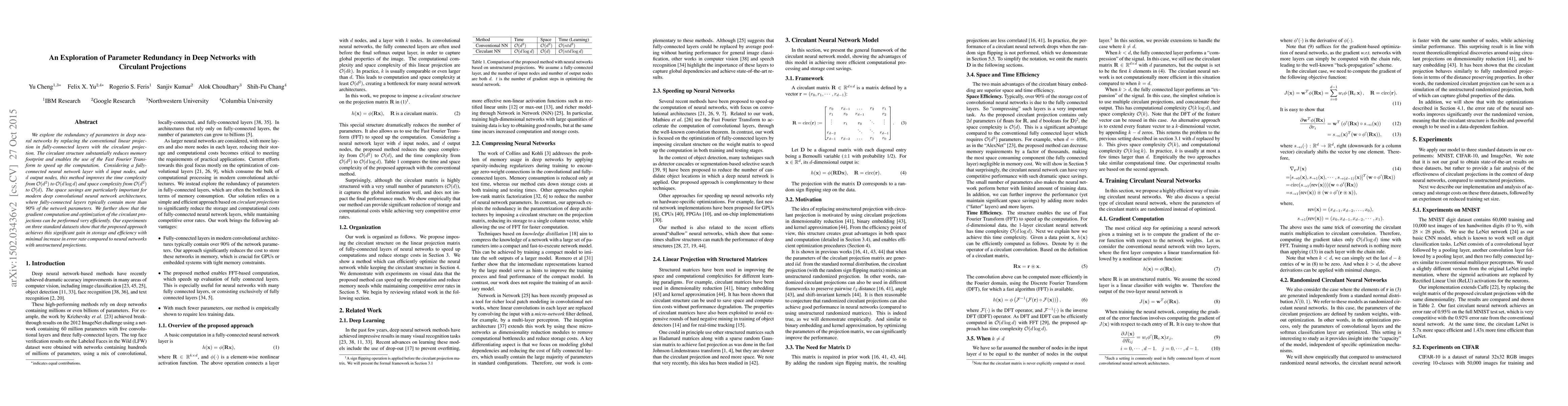 This paper investigates parameter redundancy in deep neural networks by using circulant projections instead of conventional linear projections, significantly reducing memory and computation time. The method achieves O(dlogd) time complexity and O(d) space complexity, with minimal increase in error rate on standard datasets.