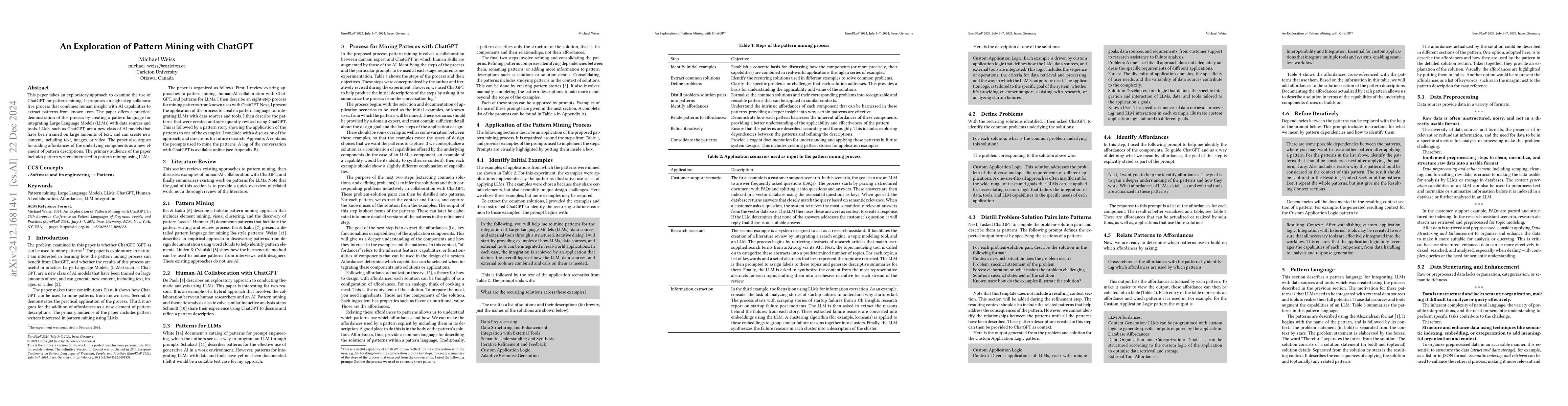 This paper explores leveraging AI, specifically LLMs like ChatGPT, for pattern mining through an eight-step collaborative process that merges human expertise with AI capabilities. It demonstrates a practical method for integrating LLMs with data sources and tools, proposing the inclusion of underlying component affordances in pattern descriptions.