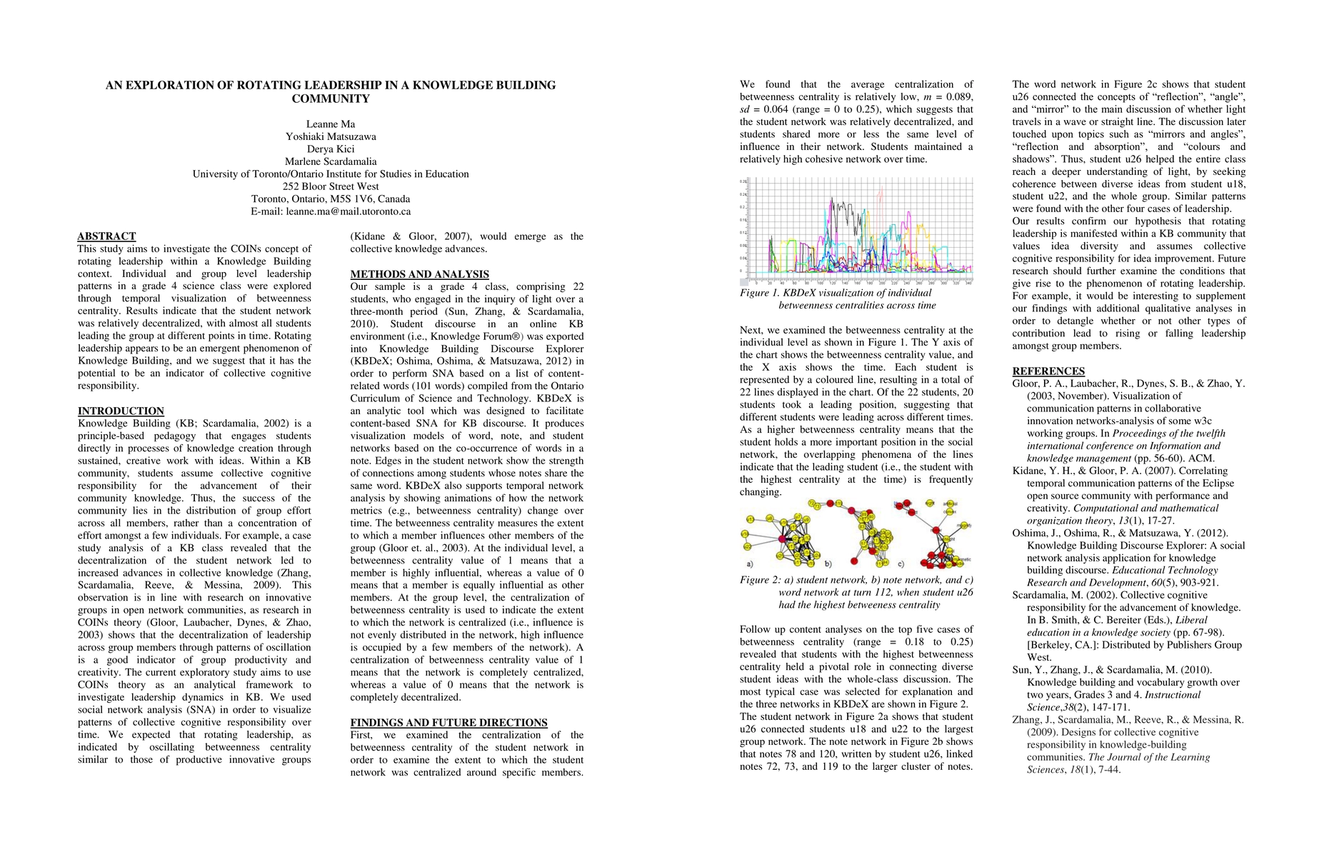 This study aims to investigate the COINs concept of rotating leadership within a Knowledge Building context. Individual and group level leadership patterns in a grade 4 science class were explored through temporal visualization of betweenness centrality. Results indicate that the student network was relatively decentralized, with almost all students leading the group at different points in time. Rotating leadership appears to be an emergent phenomenon of Knowledge Building, and we suggest that it has the potential to be an indicator of collective cognitive responsibility.