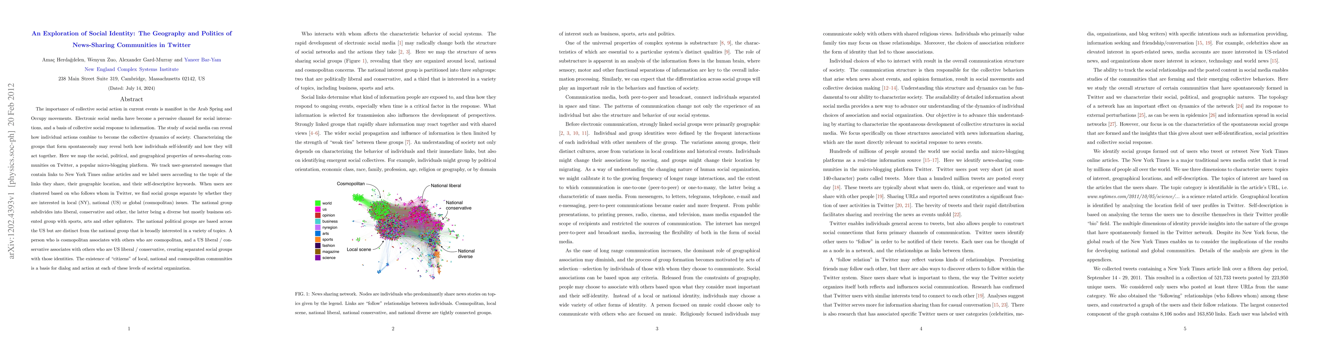 The importance of collective social action in current events is manifest in the Arab Spring and Occupy movements. Electronic social media have become a pervasive channel for social interactions, and a basis of collective social response to information. The study of social media can reveal how individual actions combine to become the collective dynamics of society. Characterizing the groups that form spontaneously may reveal both how individuals self-identify and how they will act together. Here we map the social, political, and geographical properties of news-sharing communities on Twitter, a popular micro-blogging platform. We track user-generated messages that contain links to New York Times online articles and we label users according to the topic of the links they share, their geographic location, and their self-descriptive keywords. When users are clustered based on who follows whom in Twitter, we find social groups separate by whether they are interested in local (NY), national (US) or global (cosmopolitan) issues. The national group subdivides into liberal, conservative and other, the latter being a diverse but mostly business oriented group with sports, arts and other splinters. The national political groups are based across the US but are distinct from the national group that is broadly interested in a variety of topics. A person who is cosmopolitan associates with others who are cosmopolitan, and a US liberal / conservative associates with others who are US liberal / conservative, creating separated social groups with those identities. The existence of "citizens" of local, national and cosmopolitan communities is a basis for dialog and action at each of these levels of societal organization.