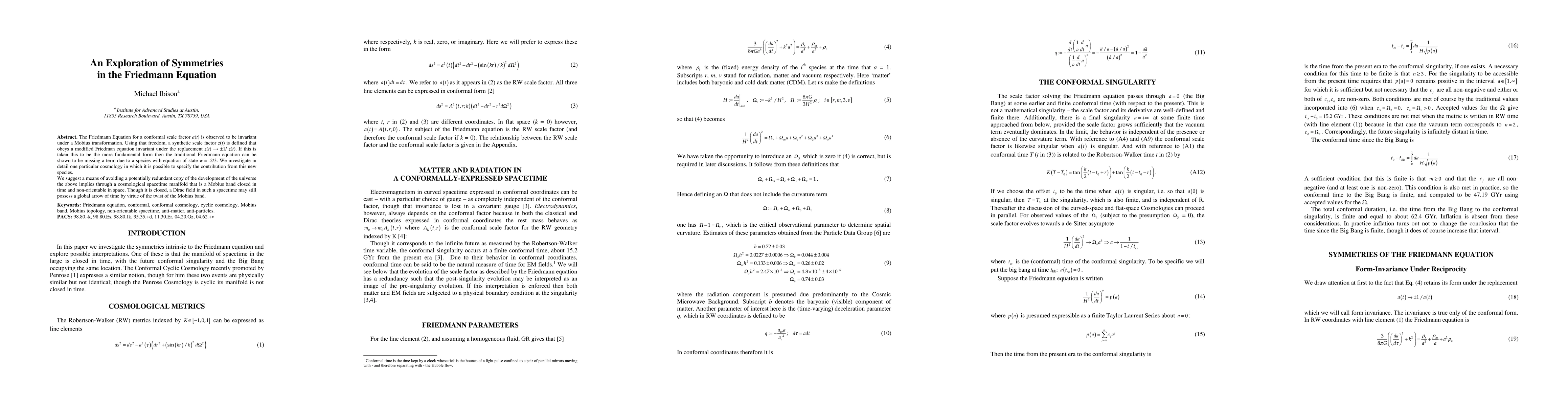 The Friedmann Equation for a conformal scale factor a(t) is observed to be invariant under a Mobius transformation. Using that freedom, a synthetic scale factor z(t) is defined that obeys a modified Friedman equation invariant under the replacement z(t) {\rightarrow} {\pm}1/ z(t). If this is taken this to be the more fundamental form then the traditional Friedmann equation can be shown to be missing a term due to a species with equation of state w = -2/3. We investigate in detail one particular cosmology in which it is possible to specify the contribution from this new species. We suggest a means of avoiding a potentially redundant copy of the development of the universe the above implies through a cosmological spacetime manifold that is a Mobius band closed in time and non-orientable in space. Though it is closed, a Dirac field in such a spacetime may still possess a global arrow of time by virtue of the twist of the Mobius band.