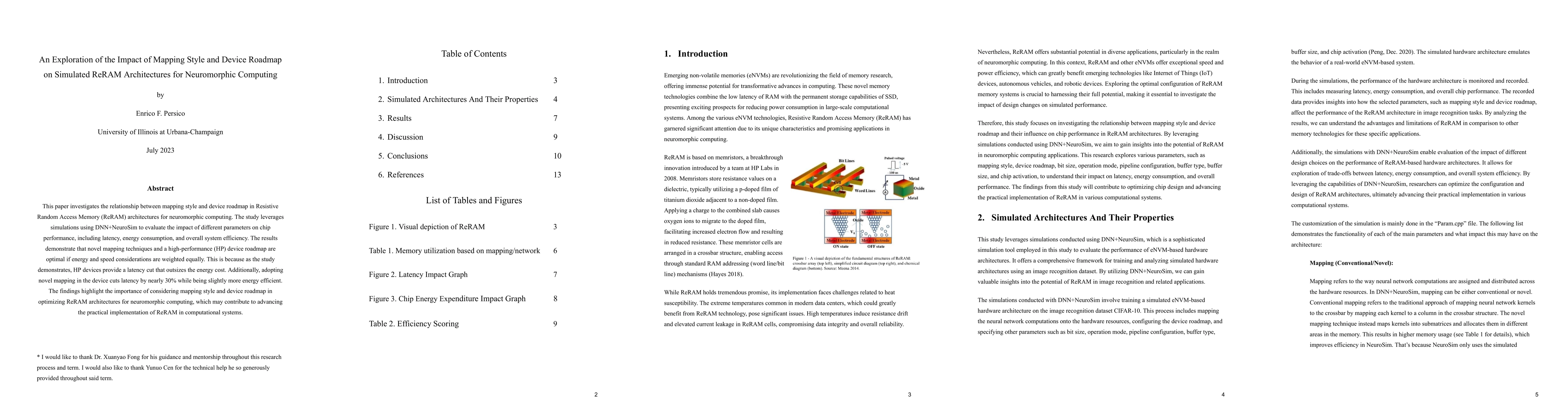 This paper investigates the relationship between mapping style and device roadmap in Resistive Random Access Memory (ReRAM) architectures for neuromorphic computing. The study leverages simulations using DNN+NeuroSim to evaluate the impact of different parameters on chip performance, including latency, energy consumption, and overall system efficiency. The results demonstrate that novel mapping techniques and a high-performance (HP) device roadmap are optimal if energy and speed considerations are weighted equally. This is because as the study demonstrates, HP devices provide a latency cut that outsizes the energy cost. Additionally, adopting novel mapping in the device cuts latency by nearly 30% while being slightly more energy efficient. The findings highlight the importance of considering mapping style and device roadmap in optimizing ReRAM architectures for neuromorphic computing, which may contribute to advancing the practical implementation of ReRAM in computational systems.