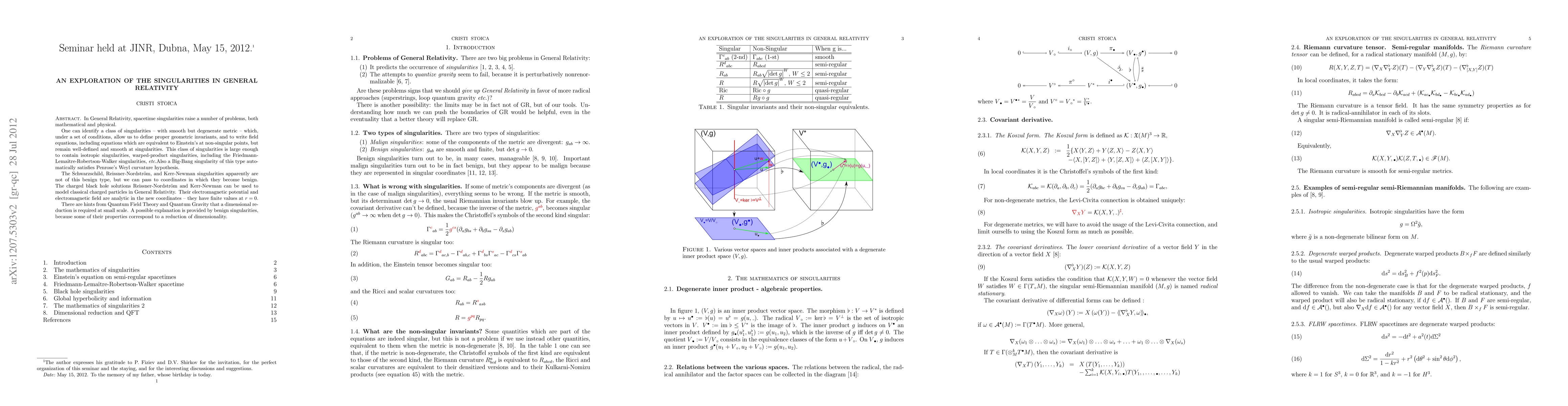 Seminar held at JINR, Dubna, May 15, 2012. In General Relativity, spacetime singularities raise a number of problems, both mathematical and physical. One can identify a class of singularities - with smooth but degenerate metric - which, under a set of conditions, allow us to define proper geometric invariants, and to write field equations, including equations which are equivalent to Einstein's at non-singular points, but remain well-defined and smooth at singularities. This class of singularities is large enough to contain isotropic singularities, warped-product singularities, including the Friedmann-Lemaitre-Robertson-Walker singularities, etc. Also a Big-Bang singularity of this type automatically satisfies Penrose's Weyl curvature hypothesis. The Schwarzschild, Reissner-Nordstrom, and Kerr-Newman singularities apparently are not of this benign type, but we can pass to coordinates in which they become benign. The charged black hole solutions Reissner-Nordstrom and Kerr-Newman can be used to model classical charged particles in General Relativity. Their electromagnetic potential and electromagnetic field are analytic in the new coordinates - they have finite values at r=0. There are hints from Quantum Field Theory and Quantum Gravity that a dimensional reduction is required at small scale. A possible explanation is provided by benign singularities, because some of their properties correspond to a reduction of dimensionality.
