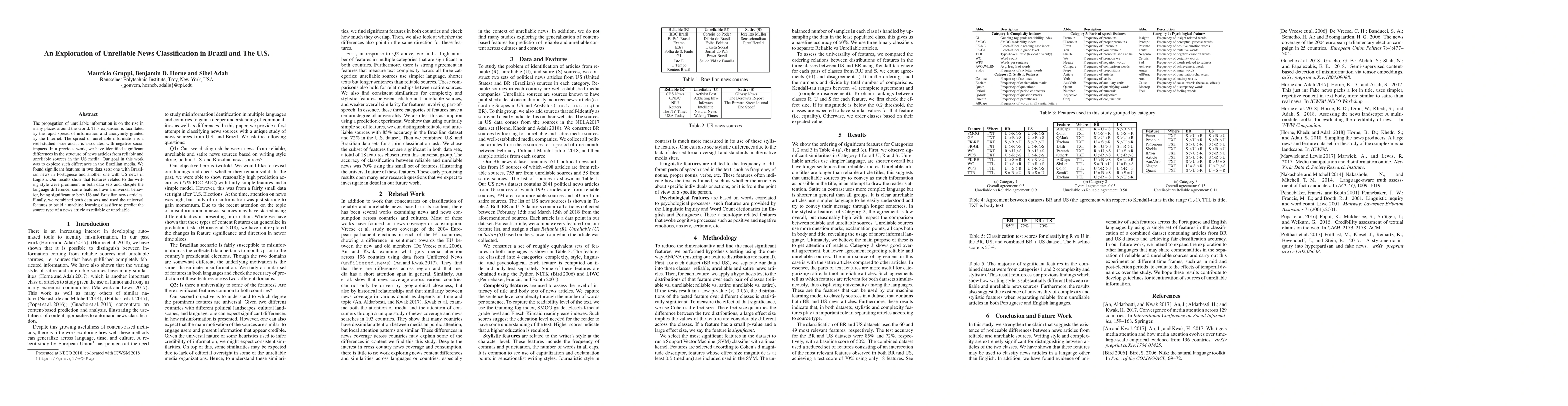 This research explores differences in news article structures between reliable and unreliable sources in Brazil and the U.S., identifying prominent writing style features common to both countries. A machine learning classifier was developed using universal features to predict the reliability of news articles.