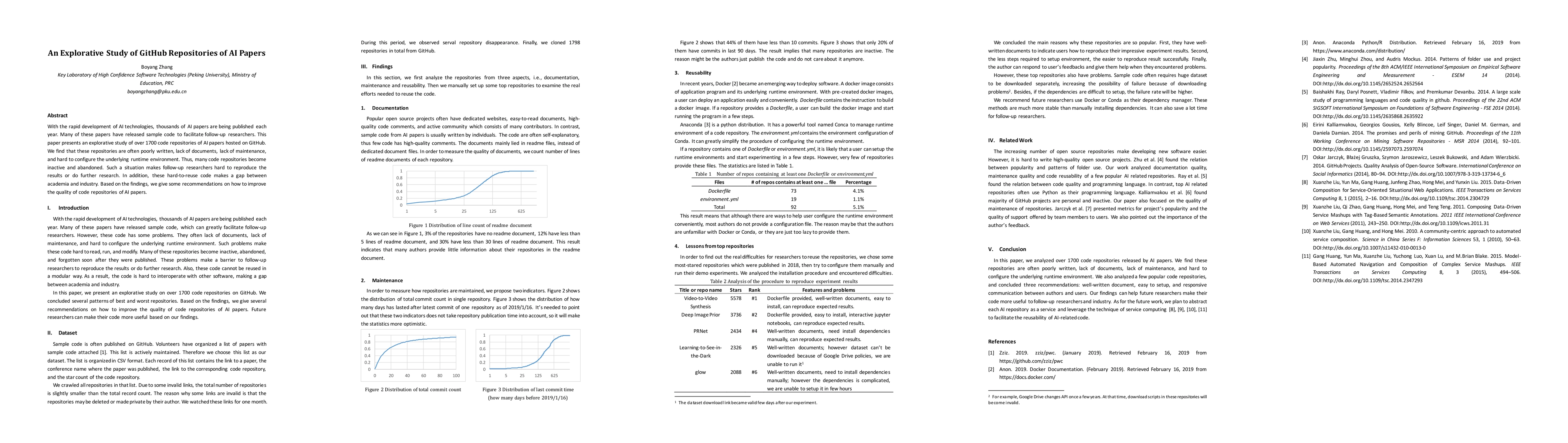 With the rapid development of AI technologies, thousands of AI papers are being published each year. Many of these papers have released sample code to facilitate follow-up researchers. This paper presents an explorative study of over 1700 code repositories of AI papers hosted on GitHub. We find that these repositories are often poorly written, lack of documents, lack of maintenance, and hard to configure the underlying runtime environment. Thus, many code repositories become inactive and abandoned. Such a situation makes follow-up researchers hard to reproduce the results or do further research. In addition, these hard-to-reuse code makes a gap between academia and industry. Based on the findings, we give some recommendations on how to improve the quality of code repositories of AI papers.