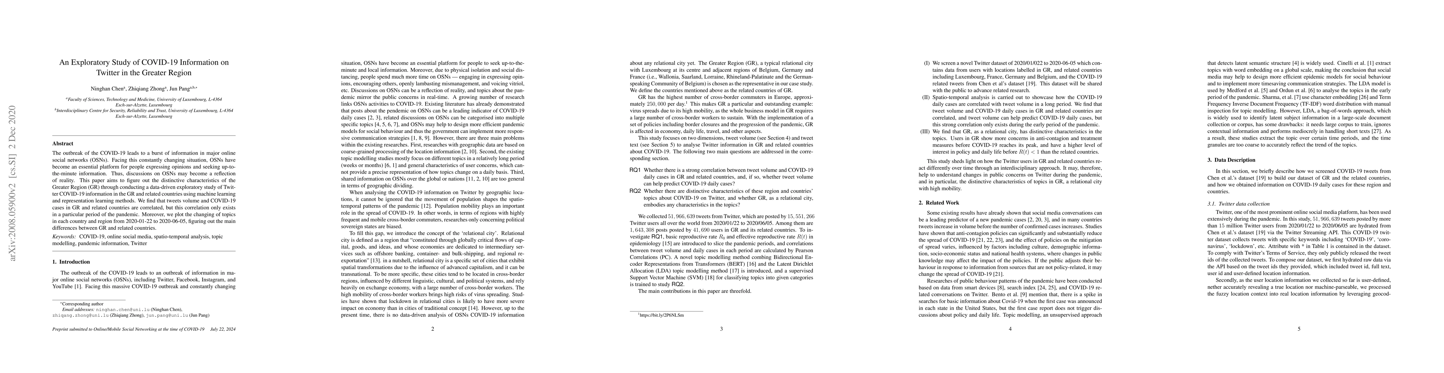 The outbreak of the COVID-19 leads to a burst of information in major online social networks (OSNs). Facing this constantly changing situation, OSNs have become an essential platform for people expressing opinions and seeking up-to-the-minute information. Thus, discussions on OSNs may become a reflection of reality. This paper aims to figure out the distinctive characteristics of the Greater Region (GR) through conducting a data-driven exploratory study of Twitter COVID-19 information in the GR and related countries using machine learning and representation learning methods. We find that tweets volume and COVID-19 cases in GR and related countries are correlated, but this correlation only exists in a particular period of the pandemic. Moreover, we plot the changing of topics in each country and region from 2020-01-22 to 2020-06-05, figuring out the main differences between GR and related countries.