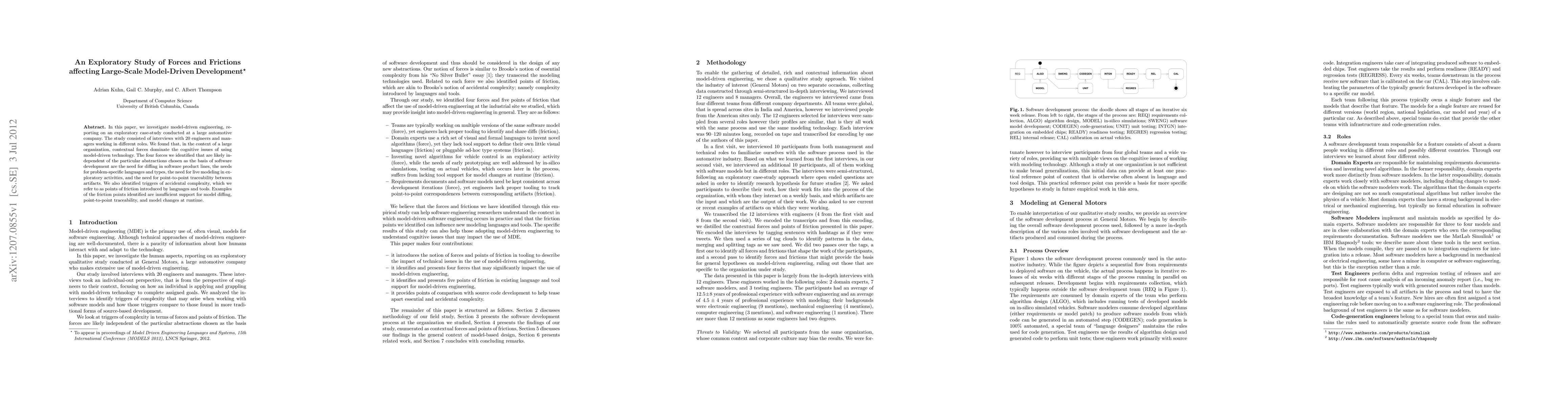 In this paper, we investigate model-driven engineering, reporting on an exploratory case-study conducted at a large automotive company. The study consisted of interviews with 20 engineers and managers working in different roles. We found that, in the context of a large organization, contextual forces dominate the cognitive issues of using model-driven technology. The four forces we identified that are likely independent of the particular abstractions chosen as the basis of software development are the need for diffing in software product lines, the needs for problem-specific languages and types, the need for live modeling in exploratory activities, and the need for point-to-point traceability between artifacts. We also identified triggers of accidental complexity, which we refer to as points of friction introduced by languages and tools. Examples of the friction points identified are insufficient support for model diffing, point-to-point traceability, and model changes at runtime.