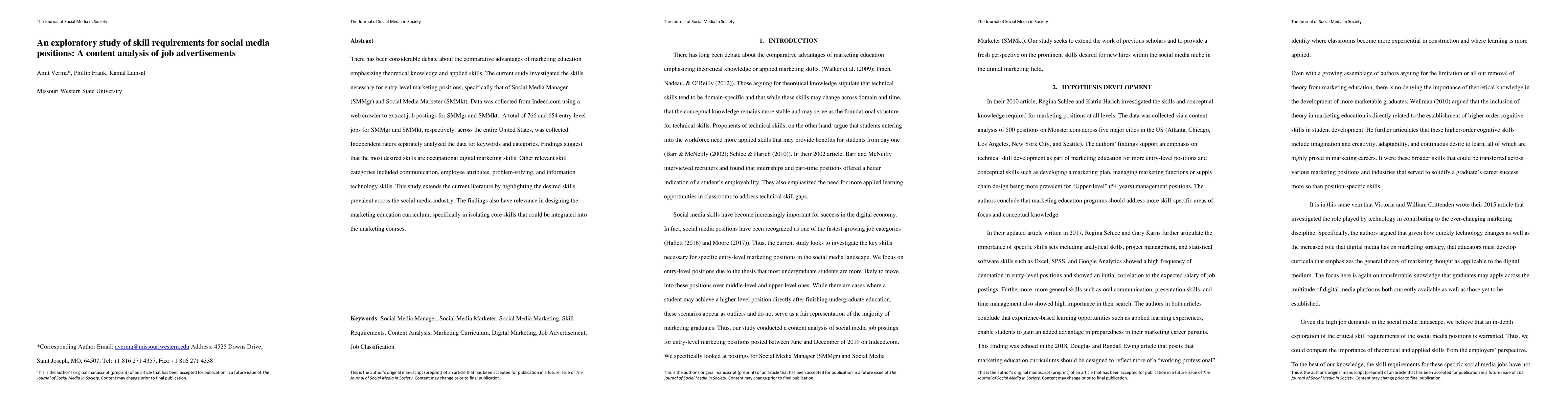 There has been considerable debate about the comparative advantages of marketing education emphasizing theoretical knowledge and applied skills. The current study investigated the skills necessary for entry-level marketing positions, specifically that of Social Media Manager (SMMgr) and Social Media Marketer (SMMkt). Data was collected from Indeed.com using a web crawler to extract job postings for SMMgr and SMMkt. A total of 766 and 654 entry-level jobs for SMMgr and SMMkt, respectively, across the entire United States, was collected. Independent raters separately analyzed the data for keywords and categories. Findings suggest that the most desired skills are occupational digital marketing skills. Other relevant skill categories included communication, employee attributes, problem-solving, and information technology skills. This study extends the current literature by highlighting the desired skills prevalent across the social media industry. The findings also have relevance in designing the marketing education curriculum, specifically in isolating core skills that could be integrated into the marketing courses.