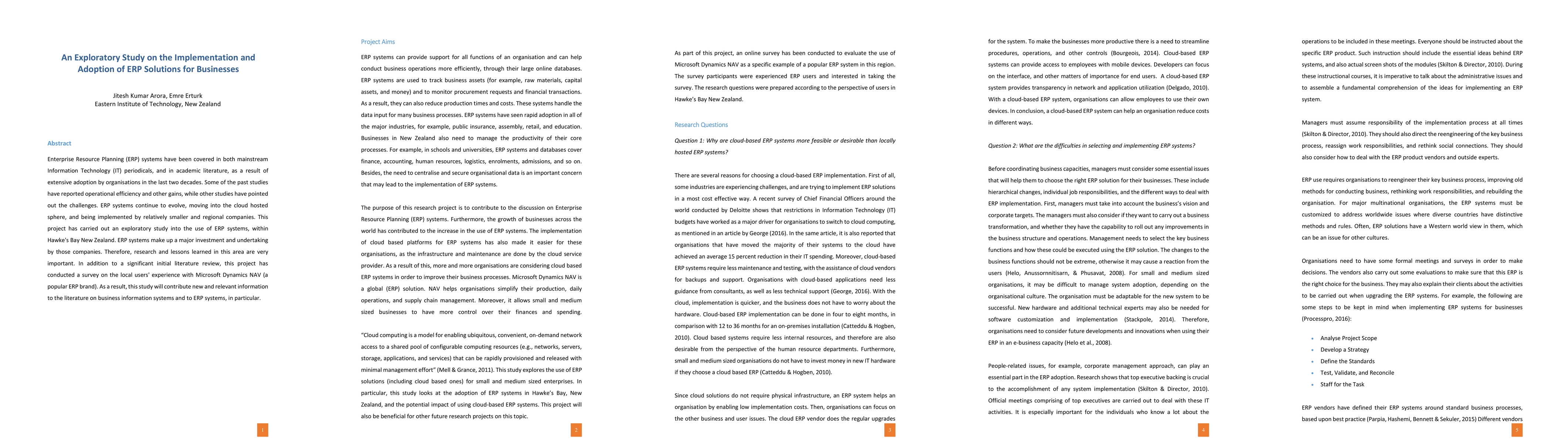 This study explores the implementation and adoption of ERP systems, particularly Microsoft Dynamics NAV, in Hawke's Bay, New Zealand, highlighting both benefits and challenges faced by local businesses. The research combines a literature review and survey results to provide new insights into ERP usage and its impact on operational efficiency.
