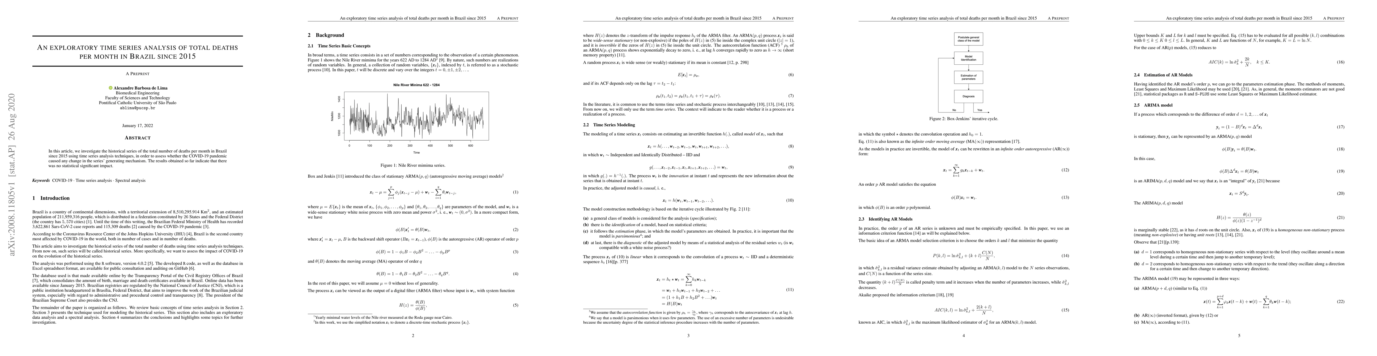 In this article, we investigate the historical series of the total number of deaths per month in Brazil since 2015 using time series analysis techniques, in order to assess whether the COVID-19 pandemic caused any change in the series' generating mechanism. The results obtained so far indicate that there was no statistical significant impact.