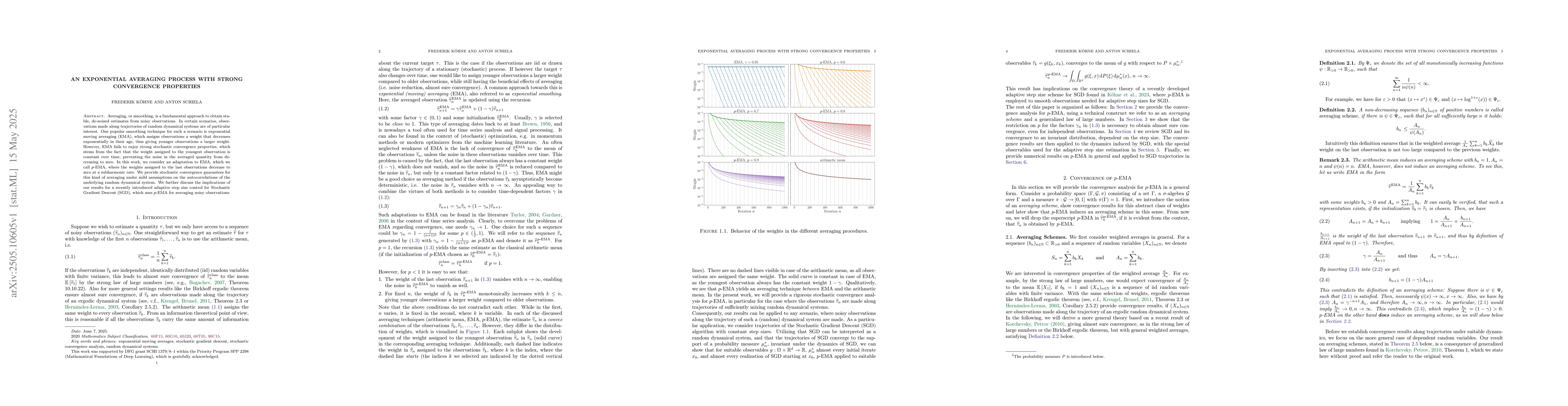 This paper introduces $p$-EMA, a smoothing technique that adapts to exponentially decrease the weight of the youngest observation, providing stronger stochastic convergence properties than traditional EMA. It offers implications for adaptive step size control in Stochastic Gradient Descent (SGD).
