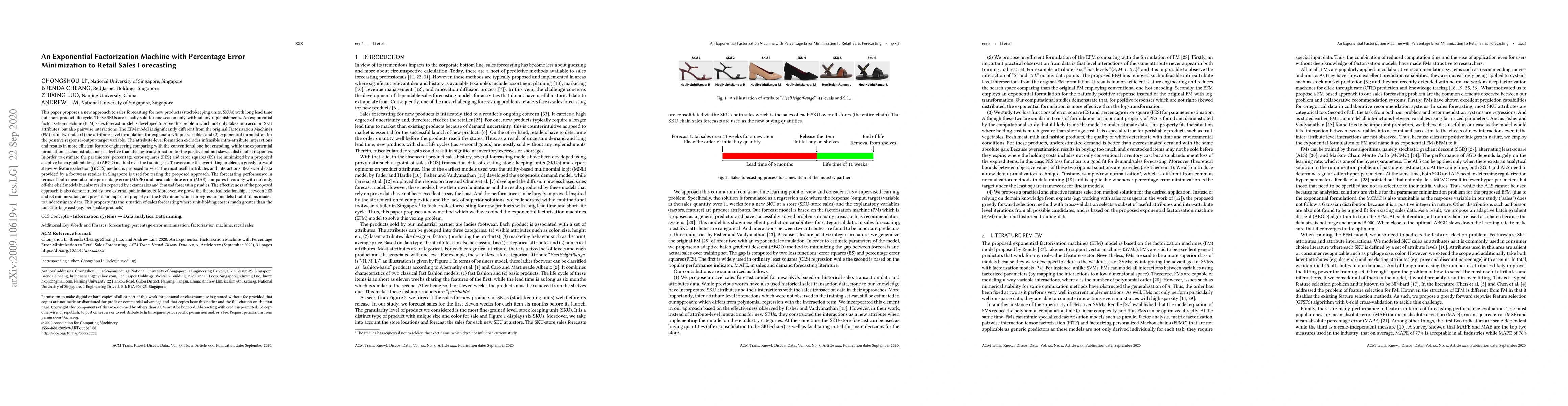 This paper proposes a new approach to sales forecasting for new products with long lead time but short product life cycle. These SKUs are usually sold for one season only, without any replenishments. An exponential factorization machine (EFM) sales forecast model is developed to solve this problem which not only considers SKU attributes, but also pairwise interactions. The EFM model is significantly different from the original Factorization Machines (FM) from two-fold: (1) the attribute-level formulation for explanatory variables and (2) exponential formulation for the positive response variable. The attribute-level formation excludes infeasible intra-attribute interactions and results in more efficient feature engineering comparing with the conventional one-hot encoding, while the exponential formulation is demonstrated more effective than the log-transformation for the positive but not skewed distributed responses. In order to estimate the parameters, percentage error squares (PES) and error squares (ES) are minimized by a proposed adaptive batch gradient descent method over the training set. Real-world data provided by a footwear retailer in Singapore is used for testing the proposed approach. The forecasting performance in terms of both mean absolute percentage error (MAPE) and mean absolute error (MAE) compares favourably with not only off-the-shelf models but also results reported by extant sales and demand forecasting studies. The effectiveness of the proposed approach is also demonstrated by two external public datasets. Moreover, we prove the theoretical relationships between PES and ES minimization, and present an important property of the PES minimization for regression models; that it trains models to underestimate data. This property fits the situation of sales forecasting where unit-holding cost is much greater than the unit-shortage cost.