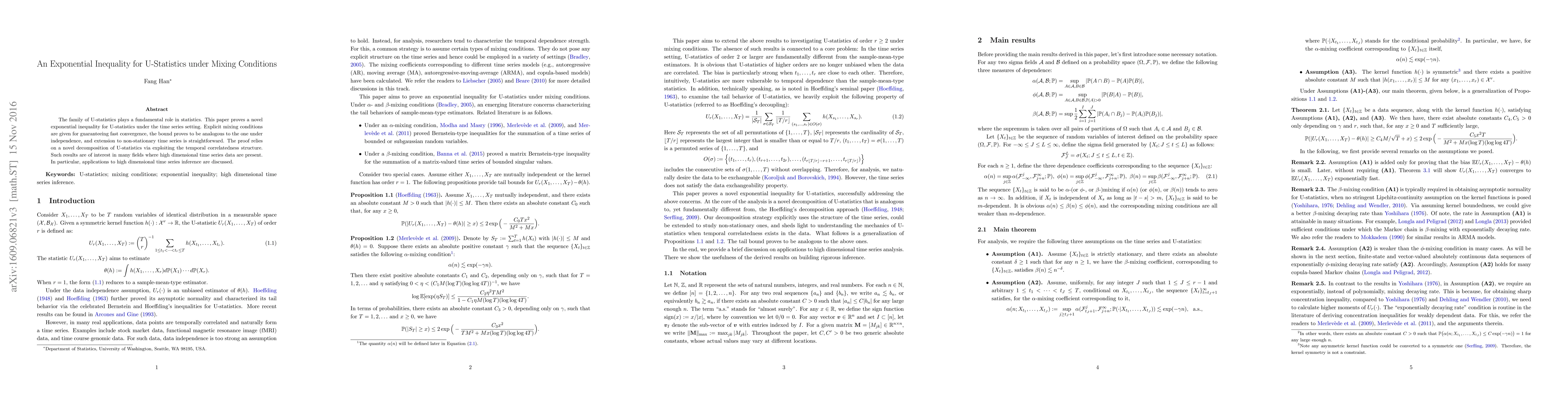 This paper presents an exponential inequality for U-statistics in time series settings, under explicit mixing conditions that ensure fast convergence. The results extend to non-stationary time series and have implications for high dimensional time series inference.