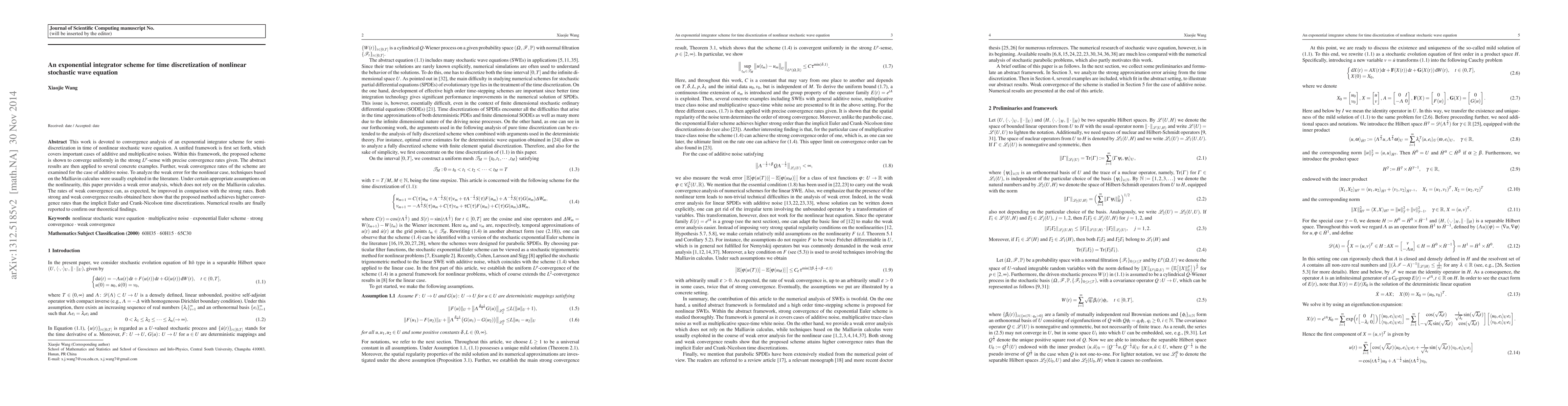 This paper presents a convergence analysis of an exponential integrator scheme for the time discretization of nonlinear stochastic wave equations, demonstrating strong and weak convergence rates superior to traditional methods. The analysis covers both additive and multiplicative noise cases, with a novel weak error analysis that avoids reliance on Malliavin calculus.
