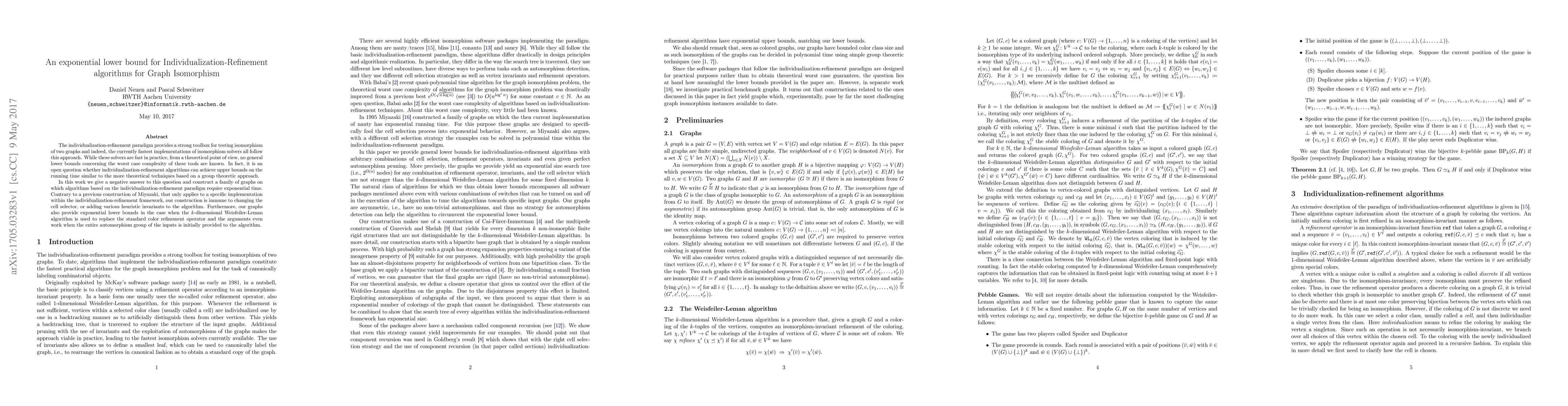 This paper establishes an exponential lower bound for individualization-refinement algorithms used in graph isomorphism testing, showing they cannot achieve upper bounds similar to group-theoretic techniques. The authors construct a family of graphs that require exponential time for these algorithms, proving their robustness against changes in implementation and heuristics.