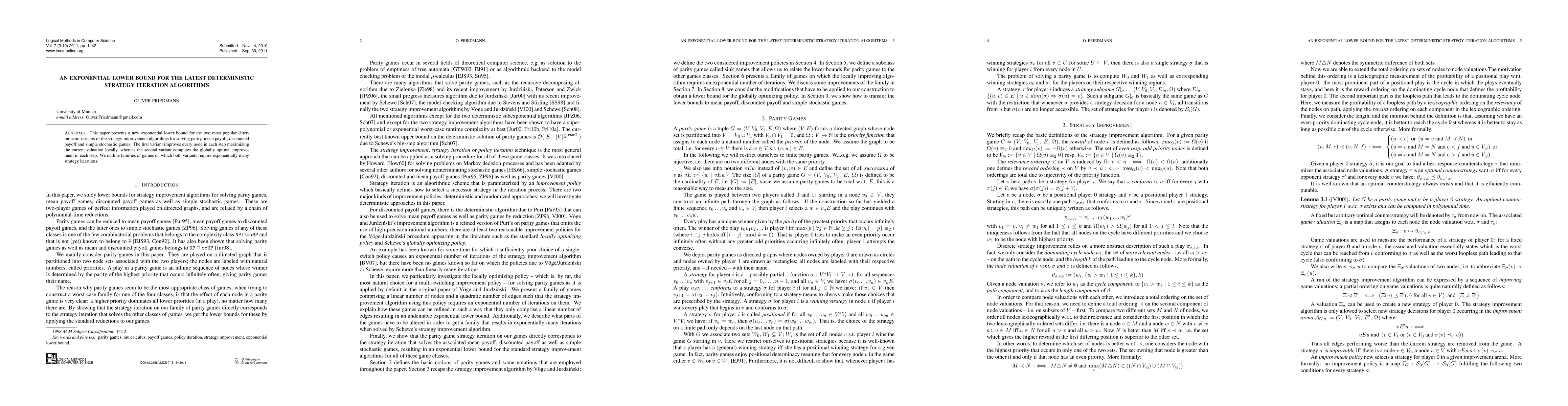 This paper establishes an exponential lower bound for two deterministic strategy improvement algorithms used in solving various types of stochastic games, demonstrating that both require exponentially many iterations on specific game families.