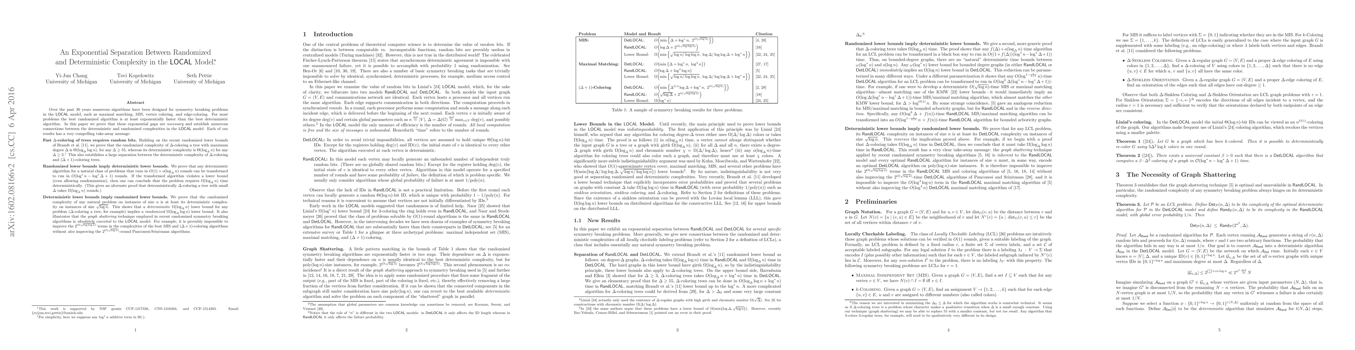 This paper demonstrates an exponential separation between randomized and deterministic complexity in the LOCAL model, proving that randomized algorithms are inherently faster. Key findings include: 1) $\Delta$-coloring trees requires randomness, with randomized complexity $\Theta(\log_\Delta\log n)$ versus deterministic $\Theta(\log_\Delta n)$. 2) Randomized lower bounds imply deterministic lower bounds, showing that efficient randomized algorithms necessitate efficient deterministic ones. 3) Deterministic lower bounds imply randomized lower bounds, highlighting the necessity of graph shattering techniques.