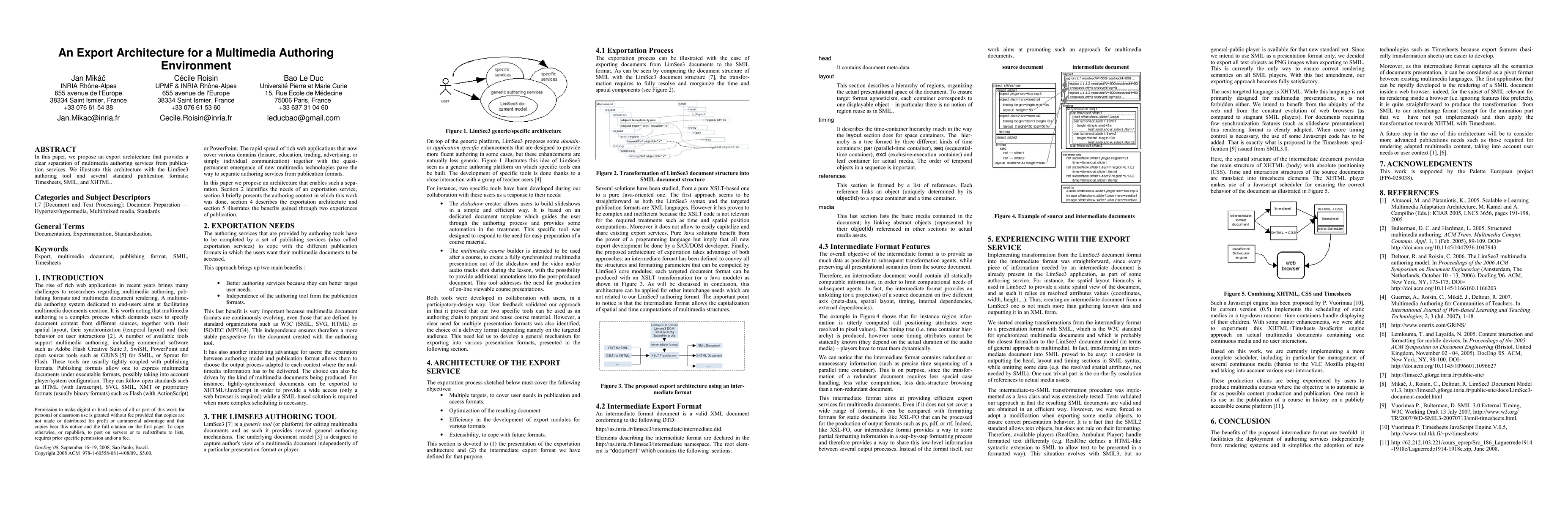 In this paper, we propose an export architecture that provides a clear separation of authoring services from publication services. We illustrate this architecture with the LimSee3 authoring tool and several standard publication formats: Timesheets, SMIL, and XHTML.