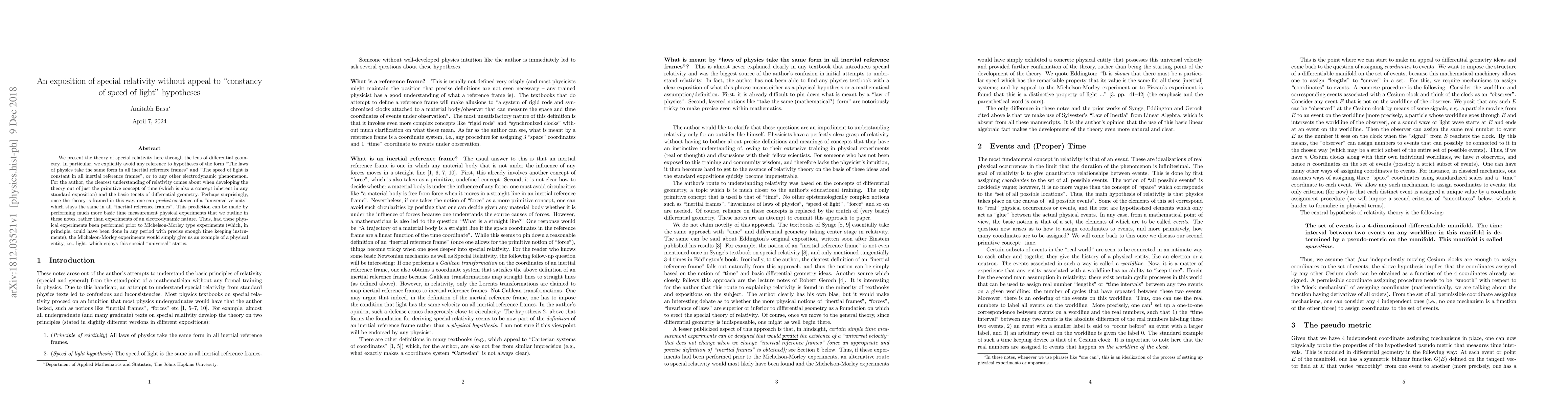 We present the theory of special relativity here through the lens of differential geometry. In particular, we explicitly avoid any reference to hypotheses of the form "The laws of physics take the same form in all inertial reference frames" and "The speed of light is constant in all inertial reference frames", or to any other electrodynamic phenomenon. For the author, the clearest understanding of relativity comes about when developing the theory out of just the primitive concept of time (which is also a concept inherent in any standard exposition) and the basic tenets of differential geometry. Perhaps surprisingly, once the theory is framed in this way, one can predict existence of a "universal velocity" which stays the same in all "inertial reference frames". This prediction can be made by performing much more basic time measurement physical experiments that we outline in these notes, rather than experiments of an electrodynamic nature. Thus, had these physical experiments been performed prior to Michelson-Morley type experiments (which, in principle, could have been done in any period with precise enough time keeping instruments), the Michelson-Morley experiments would simply give us an example of a physical entity, i.e., light, which enjoys this special "universal" status.