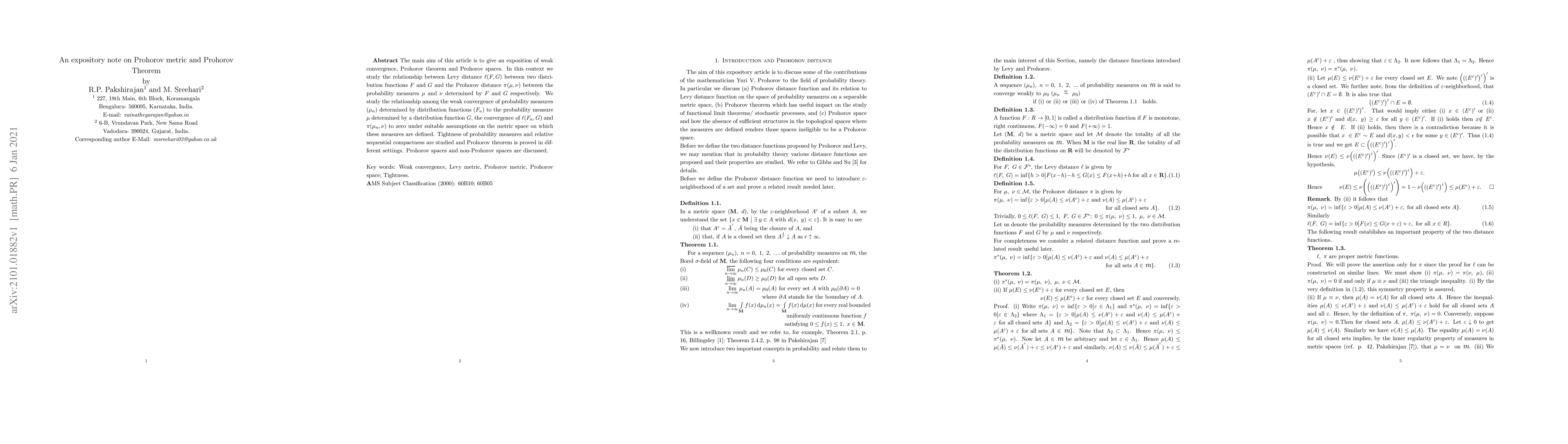 This paper provides an exposition of weak convergence, Prohorov theorem, and Prohorov spaces, focusing on the relationship between the Lévy distance and the Prohorov distance. It proves the Prohorov theorem under various conditions and discusses the tightness and relative sequential compactness of probability measures.