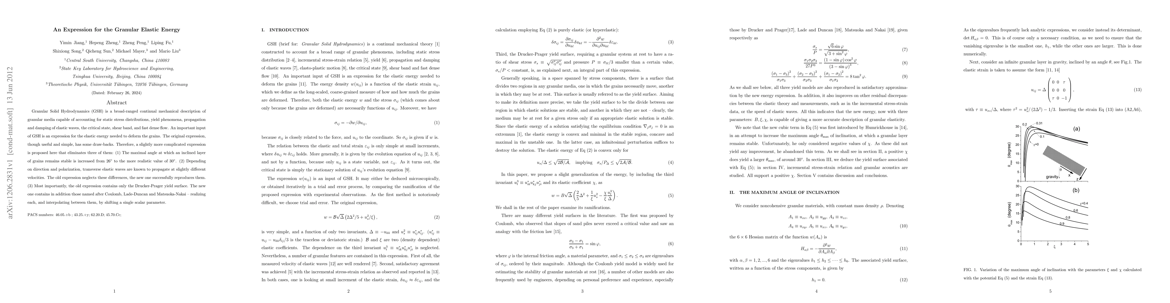 Granular Solid Hydrodynamics (GSH) is a broad-ranged continual mechanical description of granular media capable of accounting for static stress distributions, yield phenomena, propagation and damping of elastic waves, the critical state, shear band, and fast dense flow. An important input of GSH is an expression for the elastic energy needed to deform the grains. The original expression, though useful and simple, has some draw-backs. Therefore, a slightly more complicated expression is proposed here that eliminates three of them: (1) The maximal angle at which an inclined layer of grains remains stable is increased from $26^\circ$ to the more realistic value of $30^\circ$. (2)Depending on direction and polarization, transverse elastic waves are known to propagate at slightly different velocities. The old expression neglects these differences, the new one successfully reproduces them. (3) Most importantly, the old expression contains only the Drucker-Prager yield surface. The new one contains in addition those named after Coulomb, Lade-Duncan and Matsuoka-Nakai -- realizing each, and interpolating between them, by shifting a single scalar parameter.