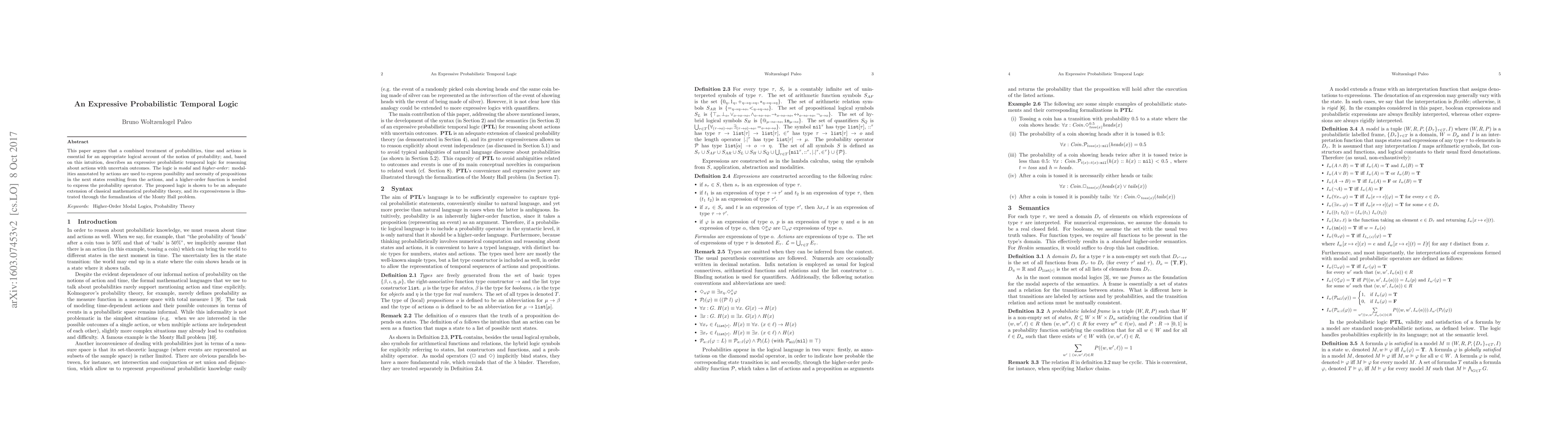 This paper introduces an expressive probabilistic temporal logic that combines probabilities, time, and actions to logically account for uncertain outcomes. It demonstrates the logic's adequacy by formalizing the Monty Hall problem, showcasing its extension of classical probability theory.