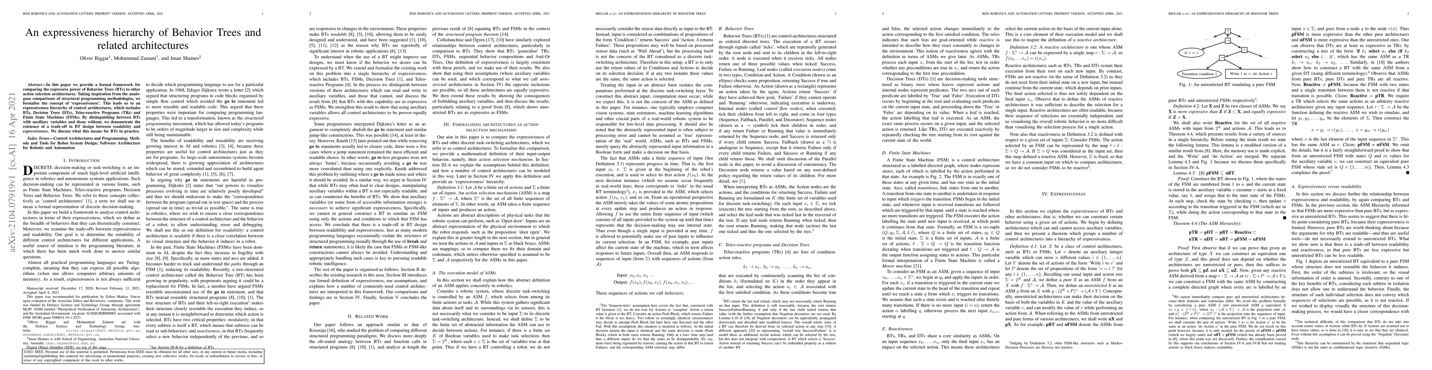 This paper establishes a formal framework to compare the expressive power of Behavior Trees (BTs) and other control architectures, leading to an expressiveness hierarchy that includes Decision Trees, Teleo-reactive Programs, and Finite State Machines. It highlights a trade-off between BT readability and expressiveness, informing practical BT design considerations.