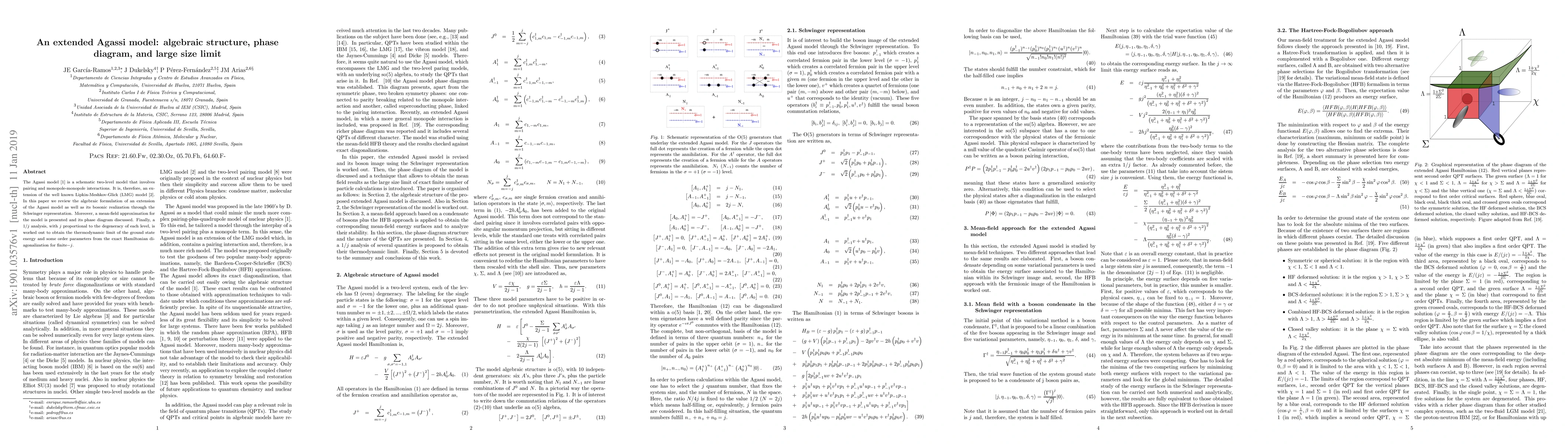The Agassi model is a schematic two-level model that involves pairing and monopole-monopole interactions. It is, therefore, an extension of the well known Lipkin-Meshkov-Glick (LMG) model. In this paper we review the algebraic formulation of an extension of the Agassi model as well as its bosonic realization through the Schwinger representation. Moreover, a mean-field approximation for the model is presented and its phase diagram discussed. Finally, a $1/j$ analysis, with $j$ proportional to the degeneracy of each level, is worked out to obtain the thermodynamic limit of the ground state energy and some order parameters from the exact Hamiltonian diagonalization for finite$-j$.