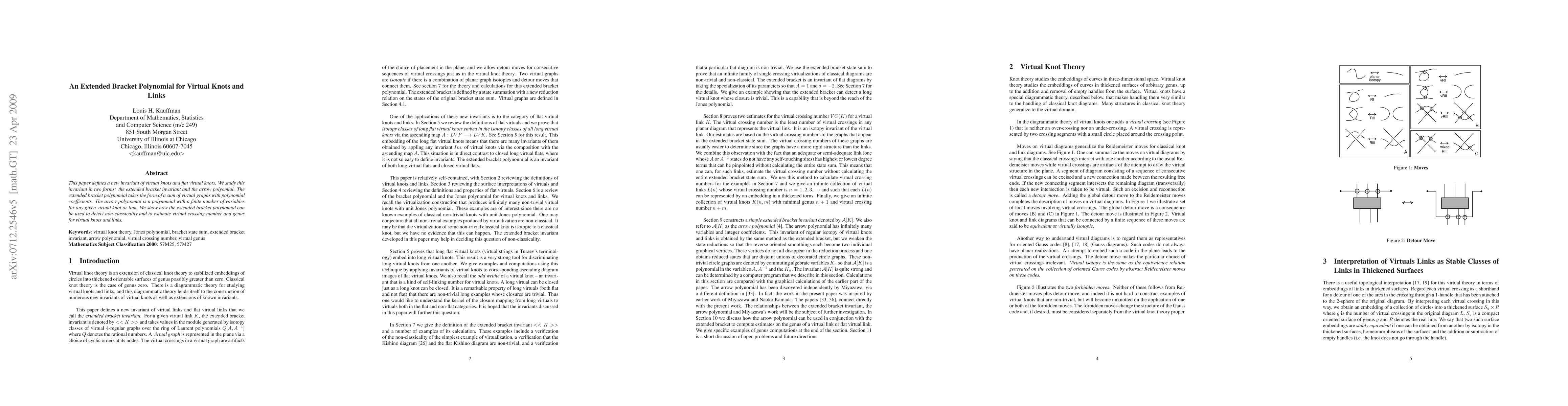 This paper introduces an extended bracket polynomial <<K>> for virtual knots and links, providing a new invariant based on state summation over bracket states. It also presents the arrow polynomial A[K], a simplified version, which is strong and easily computable, and includes a computer algorithm to determine the minimum genus surfaces for some virtual knots.