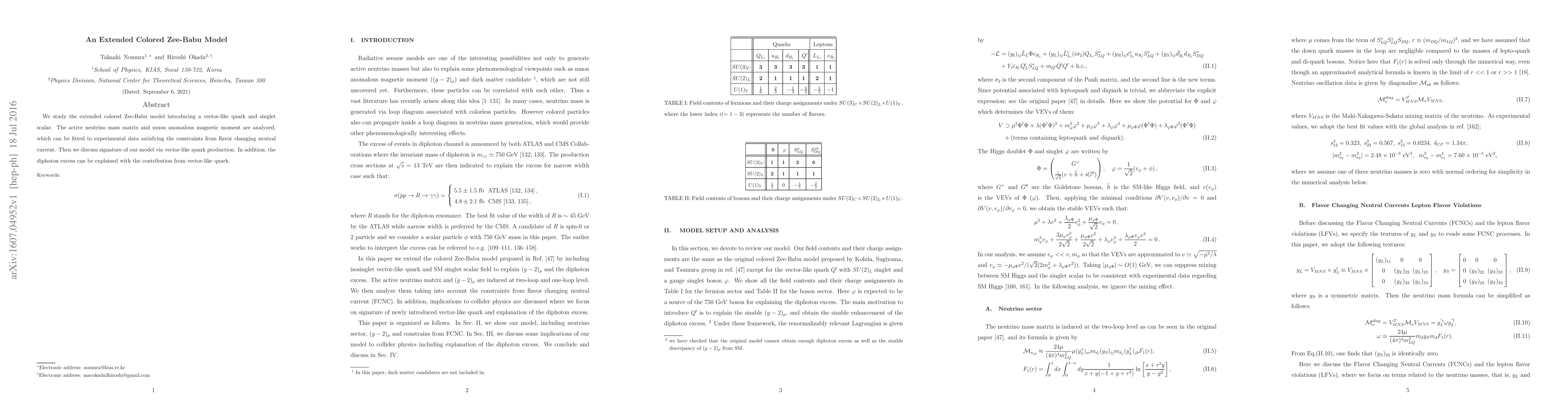 We study the extended colored Zee-Babu model introducing a vector-like quark and singlet scalar. The active neutrino mass matrix and muon anomalous magnetic moment are analyzed, which can be fitted to experimental data satisfying the constraints from flavor changing neutral current. Then we discuss signature of our model via vector-like quark production. In addition, the diphoton excess can be explained with the contribution from vector-like quark
