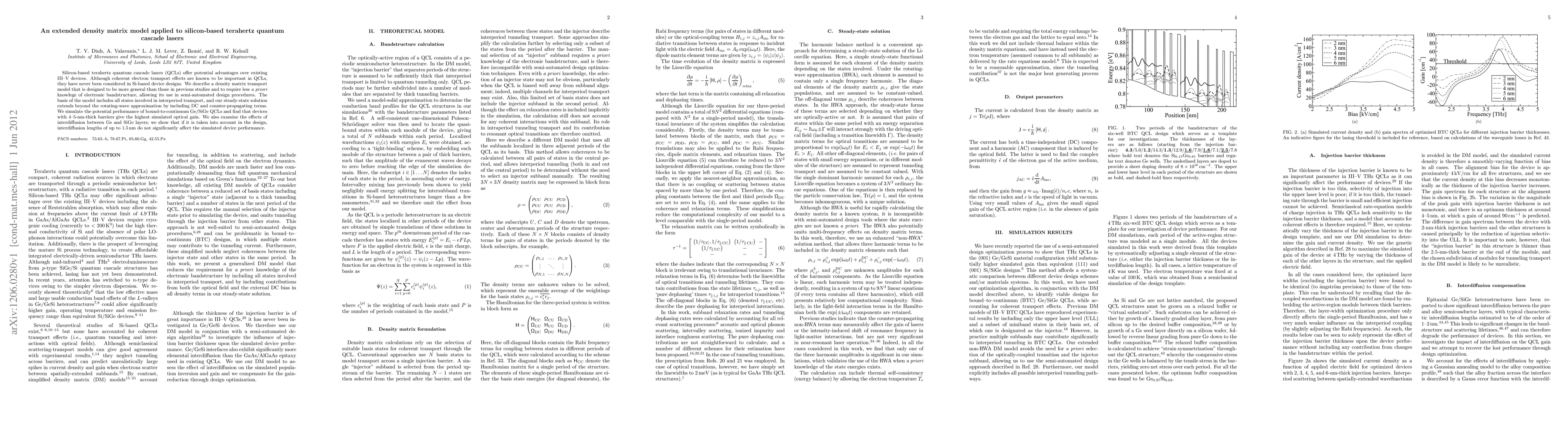 This paper introduces an extended density matrix transport model for silicon-based terahertz quantum cascade lasers, emphasizing its general applicability and reduced need for detailed band structure knowledge. The model's steady-state solution includes DC and counter-propagating terms, and simulations suggest that 4-5 nm thick barriers yield the highest optical gain, while interdiffusion up to 1.5 nm has minimal impact on performance.