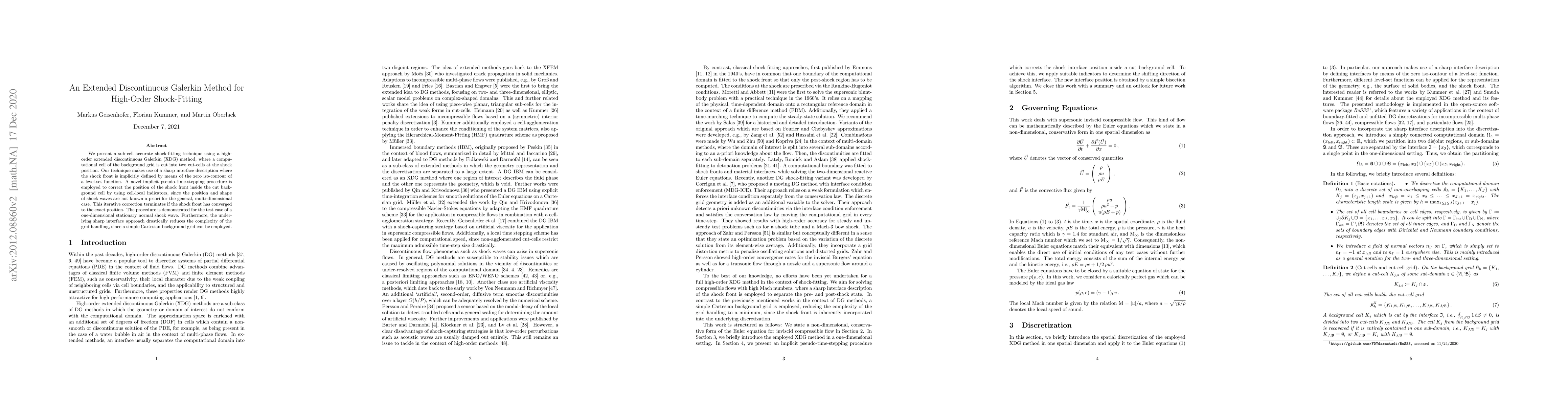 We present a sub-cell accurate shock-fitting technique using a high-order extended discontinuous Galerkin (XDG) method, where a computational cell of the background grid is cut into two cut-cells at the shock position. Our technique makes use of a sharp interface description where the shock front is implicitly defined by means of the zero iso-contour of a level-set function. A novel implicit pseudo-time-stepping procedure is employed to correct the position of the shock front inside the cut background cell by using cell-local indicators, since the position and shape of shock waves are not known a priori for the general, multi-dimensional case. This iterative correction terminates if the shock front has converged to the exact position. The procedure is demonstrated for the test case of a one-dimensional stationary normal shock wave. Furthermore, the underlying sharp interface approach drastically reduces the complexity of the grid handling, since a simple Cartesian background grid can be employed.