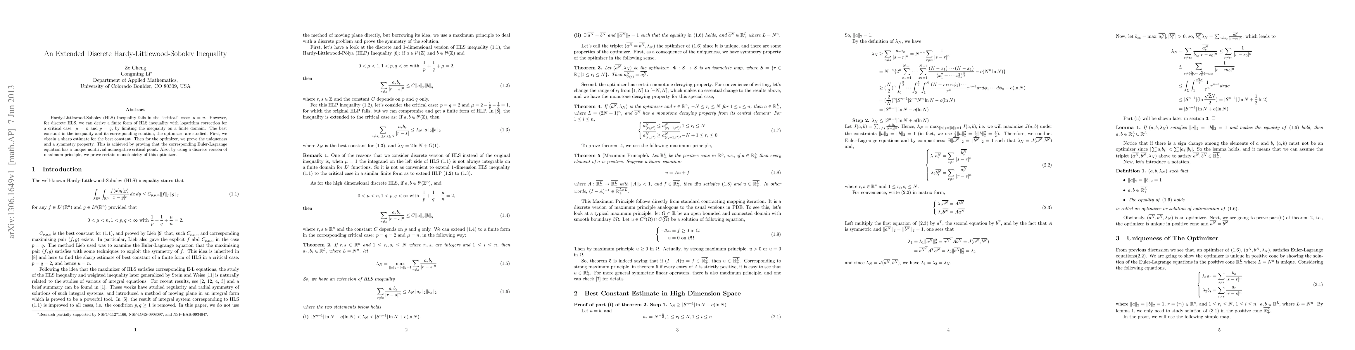 Hardy-Littlewood-Sobolev (HLS) Inequality fails in the "critical" case: \mu=n. However, for discrete HLS, we can derive a finite form of HLS inequality with logarithm correction for a critical case: \mu=n and p=q, by limiting the inequality on a finite domain. The best constant in the inequality and its corresponding solution, the optimizer, are studied. First, we obtain a sharp estimate for the best constant. Then for the optimizer, we prove the uniqueness and a symmetry property. This is achieved by proving that the corresponding Euler-Lagrange equation has a unique nontrivial nonnegative critical point. Also, by using a discrete version of maximum principle, we prove certain monotonicity of this optimizer.