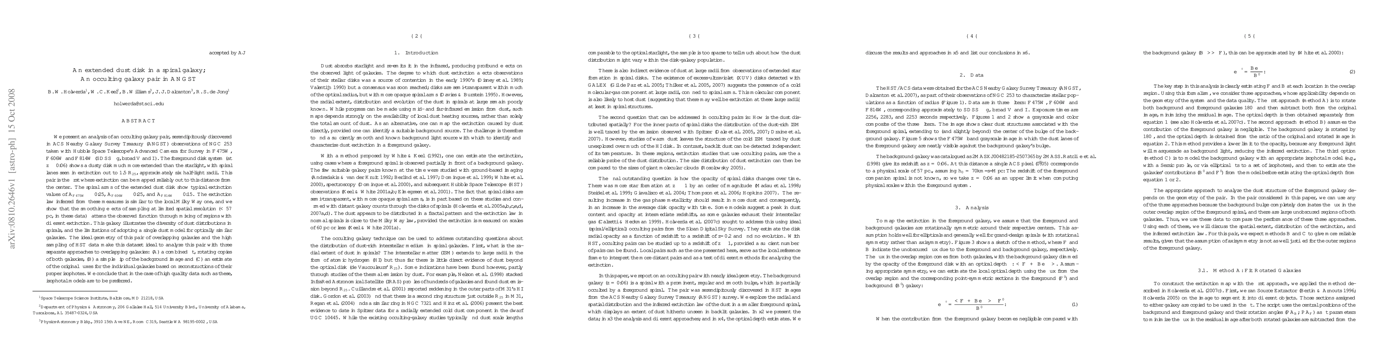 We present an analysis of an occulting galaxy pair, serendipitously discovered in ACS Nearby Galaxy Survey Treasury (ANGST) observations of NGC 253 taken with Hubble Space Telescope's Advanced Camera for Survey in F475W, F606W$ and F814W (SDSS-g, broad V and I). The foreground disk system (at z < 0.06) shows a dusty disk much more extended than the starlight, with spiral lanes seen in extinction out to 1.5 R\_25, approximately six half-light radii. This pair is the first where extinction can be mapped reliably out to this distance from the center. The spiral arms of the extended dust disk show typical extinction values of A\_F475W ~ 0.25, A\_F606W ~ 0.25, and A\_F814W ~ 0.15. The extinction law inferred from these measures is similar to the local Milky Way one, and we show that the smoothing effects of sampling at limited spatial resolution (<57 pc, in these data) flattens the observed function through mixing of regions with different extinction. This galaxy illustrates the diversity of dust distributions in spirals, and the limitations of adopting a single dust model for optically similar galaxies. The ideal geometry of this pair of overlapping galaxies and the high sampling of HST data make this dataset ideal to analyze this pair with three separate approaches to overlapping galaxies: (A) a combined fit, rotating copies of both galaxies, (B) a simple flip of the background image and (C) an estimate of the original fluxes for the individual galaxies based on reconstructions of their proper isophotes. We conclude that in the case of high quality data such as these, isophotal models are to be preferred.